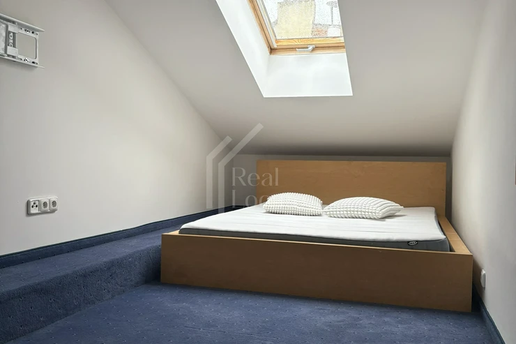 The apartment is located in a prime area in Vinohrady, Prague 2. Ideal for young couples thanks to all local amenities. The duplex features a spacious terrace with a view into the courtyard, providing a pleasant seating area outdoors.