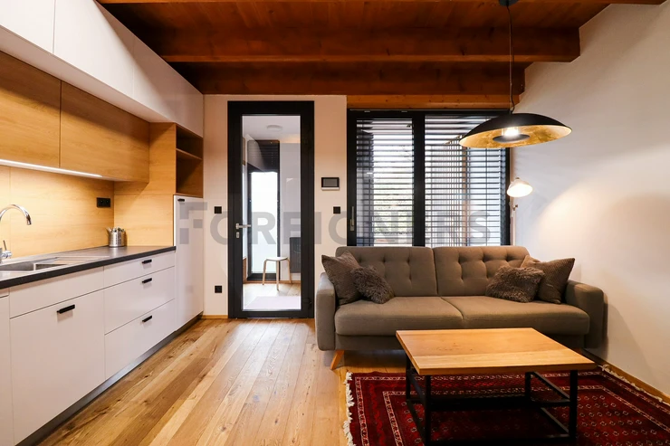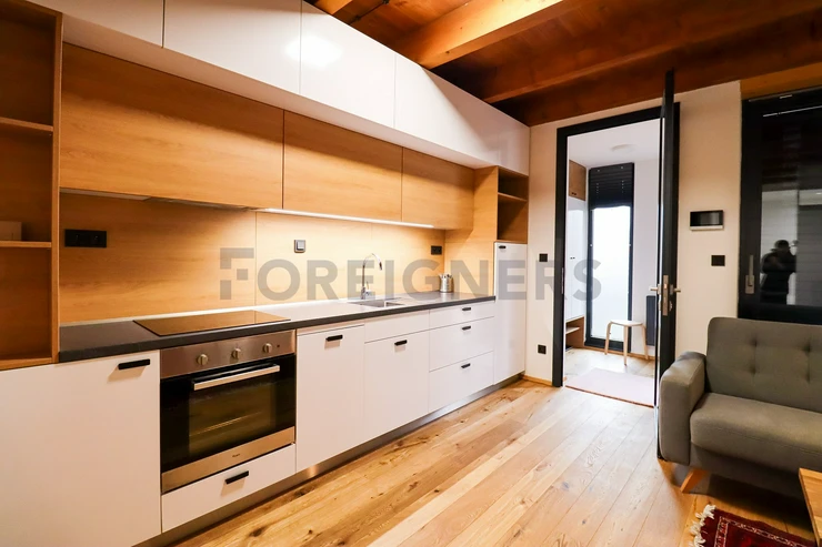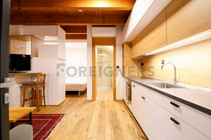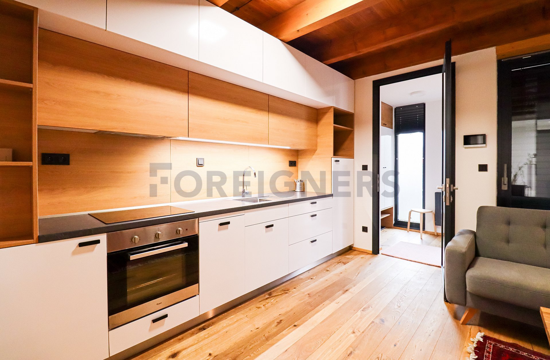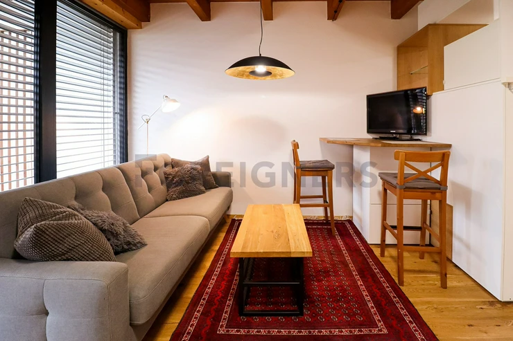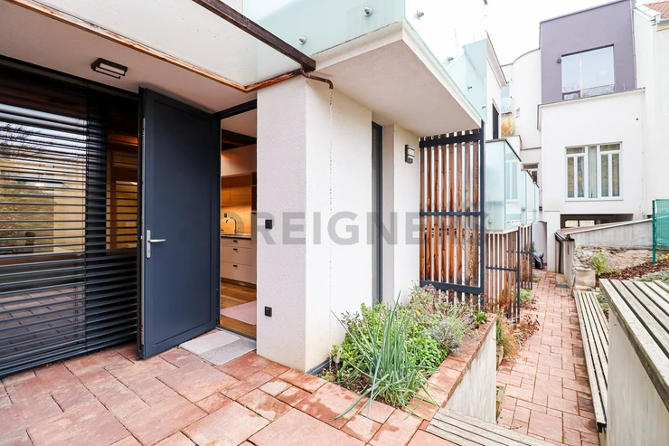 We offer for rent a modern, fully furnished studio apartment (1+kk) with a total area of 35 m², including a private terrace (7 m²) and access to a shared inner courtyard garden, located on Kamenná Street, just a few steps from the new Svratka river promenade.