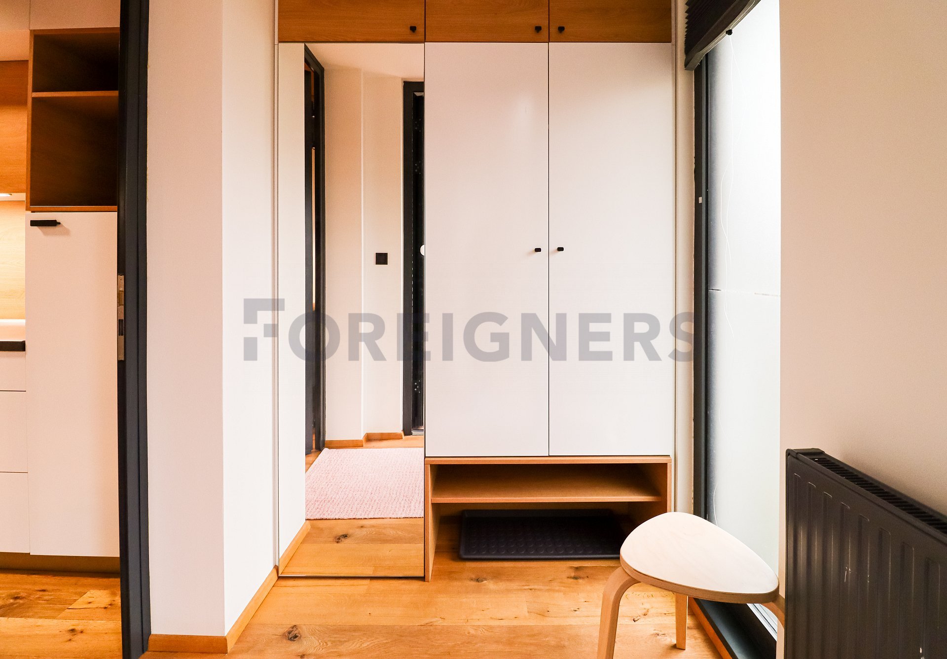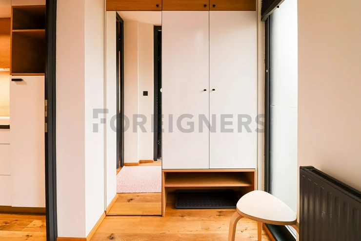 The apartment is smartly designed, with the main living area visually divided into a working zone and a relaxation area.