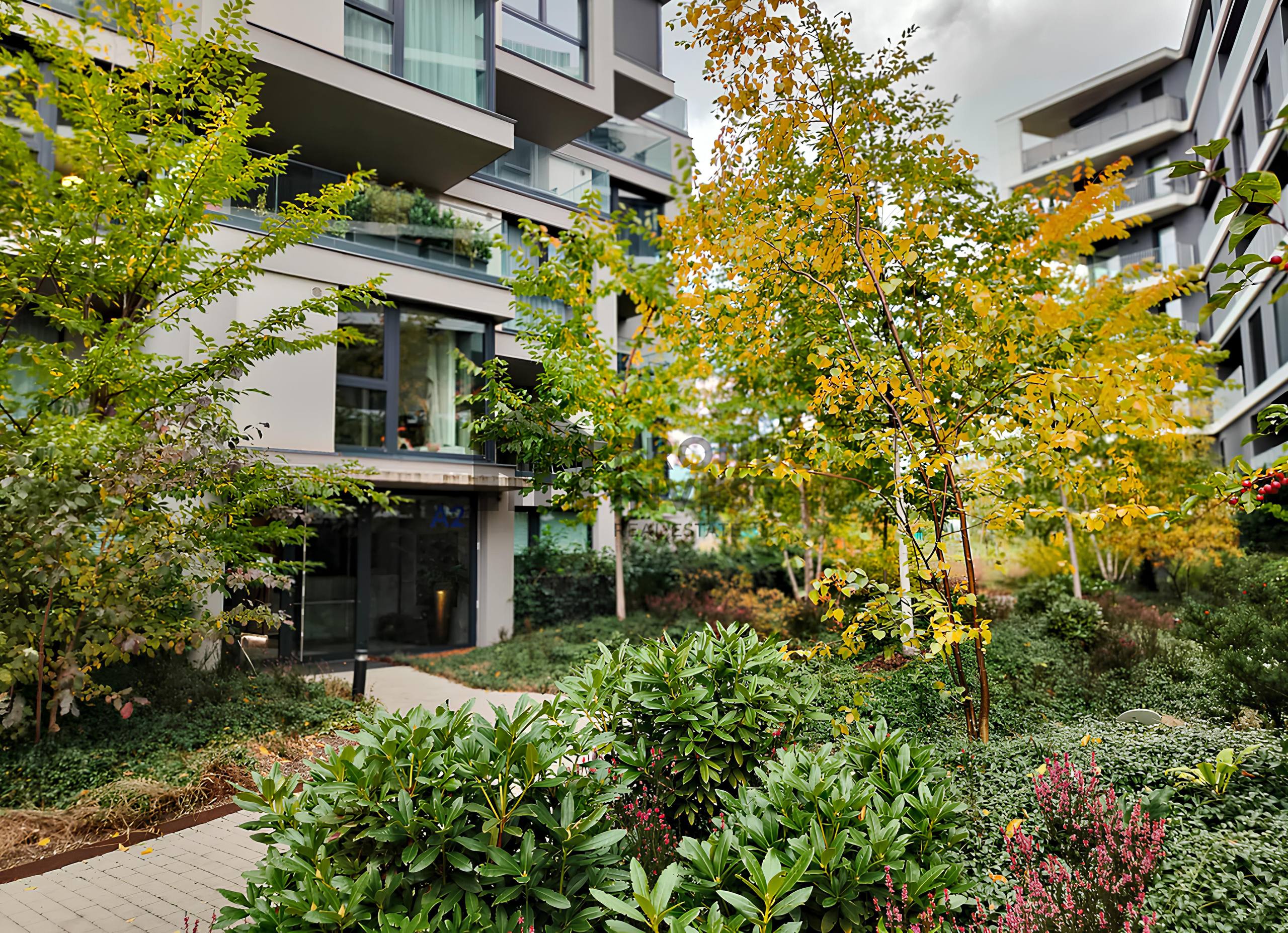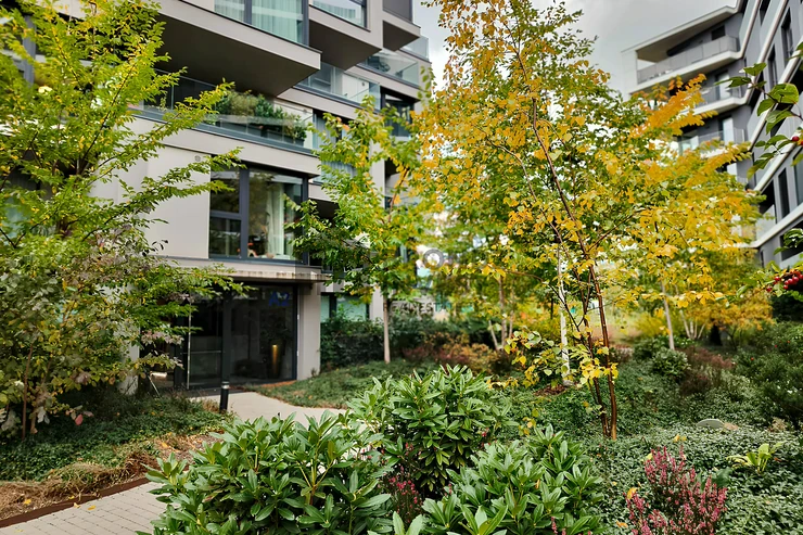 The complex is separated from the road by another building, the inner block is well-maintained and designated for residents only.
