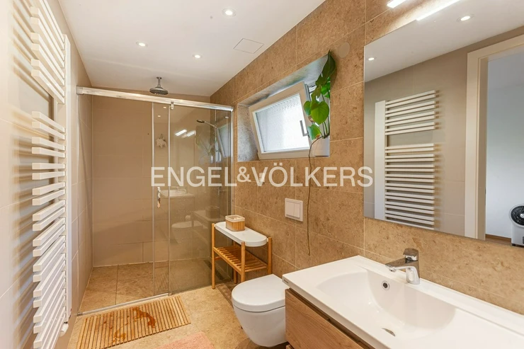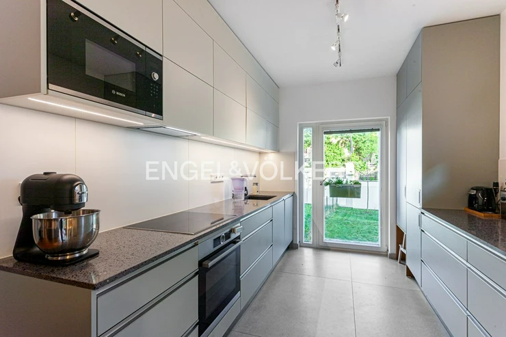 The apartment has a fully equipped kitchen. The kitchen is connected to the living room, which has direct access to the garden. The garden is oriented to the east. The living area is divided by built-in custom-made wardrobes, which form a working area with ample privacy. The bathroom with a shower is of the en-suite type and is therefore located directly off the bedroom. The apartment has a separate utility room and a separate second toilet. Washer and dryer are included in the rental.