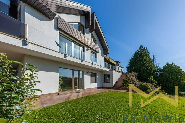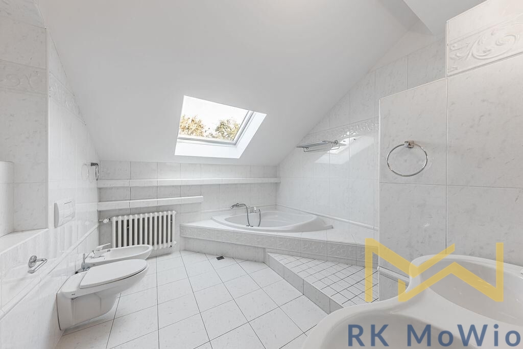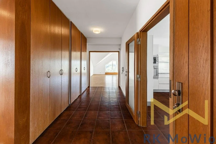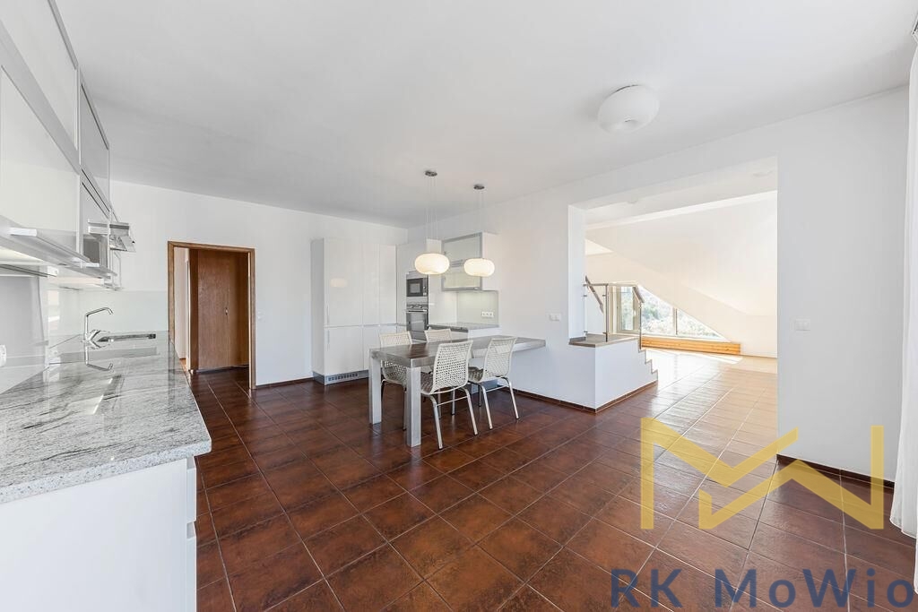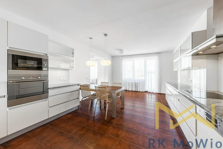 The layout of the 290 sqm unit includes, on the lower floor: an entrance hall, a bright and spacious living room, a separate kitchen, four bedrooms, a study, two bathrooms (featuring a shower, corner massage bathtub, two sinks, a bidet, and a toilet), a gallery, and a balcony. On the upper floor, there is an open gallery that can be used as a playroom and an additional bedroom. Other apartment features include: a kitchen unit with a fridge and freezer, stovetop, electric oven, dishwasher, extractor hood, and microwave; fittings for a washing machine and dryer, curtains, high-speed internet preparation, wooden floors, and tile flooring.