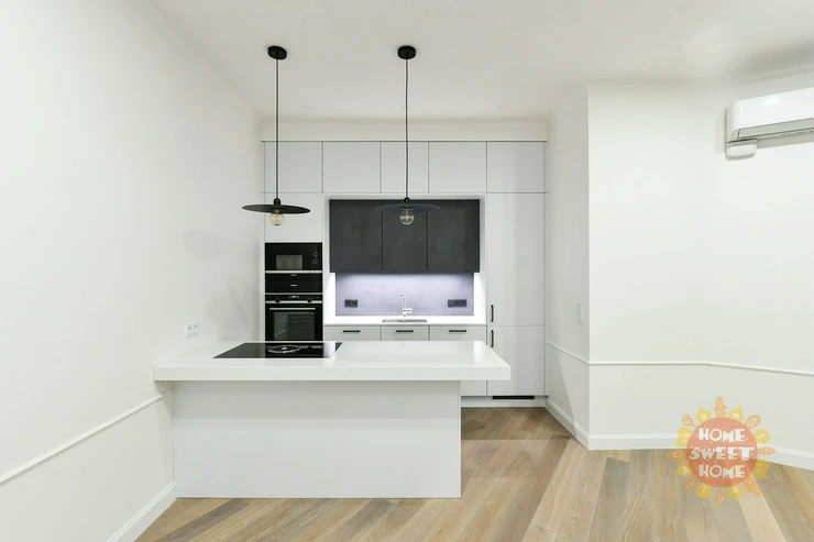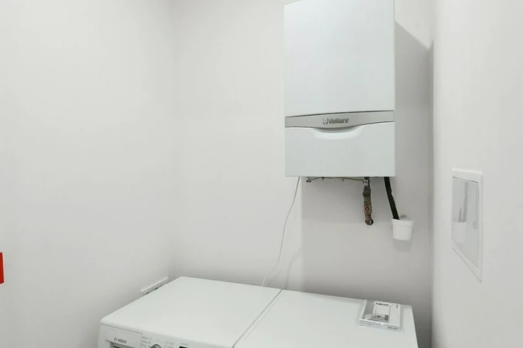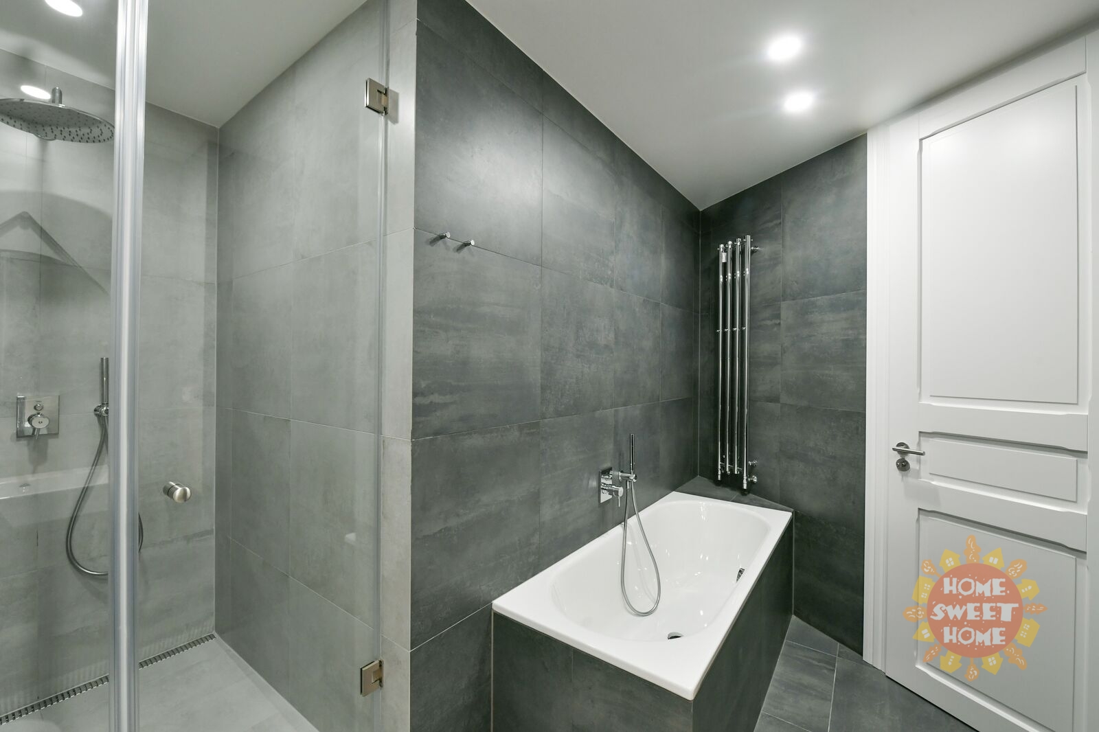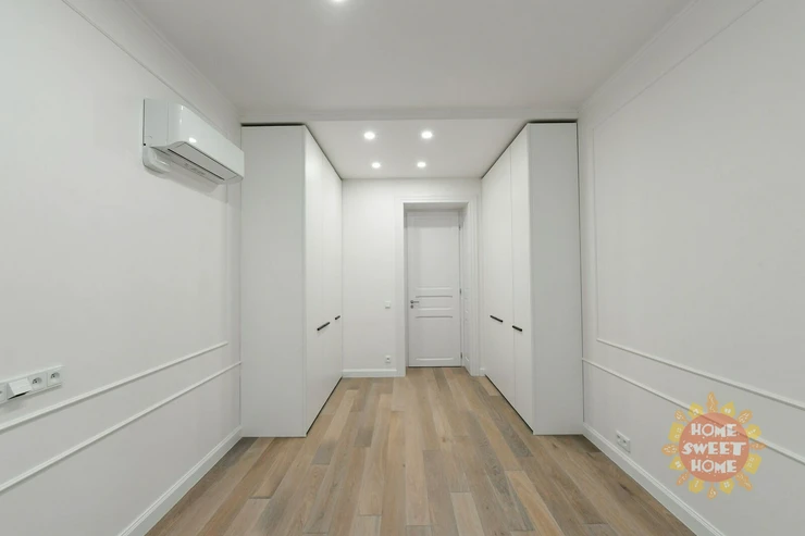 Entrance hall with built-in wardrobes, spacious living room with kitchen and dining area, two separate bedrooms, study, bathroom with shower, bathtub, and toilet, additional separate toilet, and utility room. The kitchenette is fully equipped with modern appliances. Plenty of storage space – built-in wardrobes in every room. High-quality materials have been used throughout the apartment, including oak parquet floors, designer tiles, a gas boiler, security door, washing machine, and dryer. One parking space located 350 meters from the building is included in the rent.