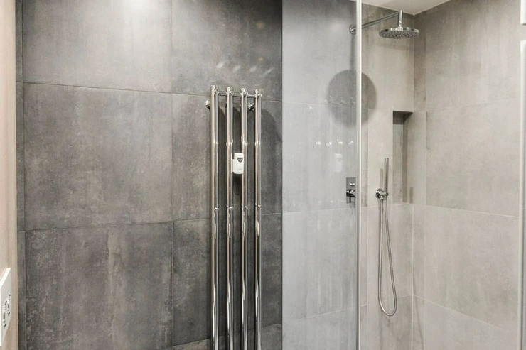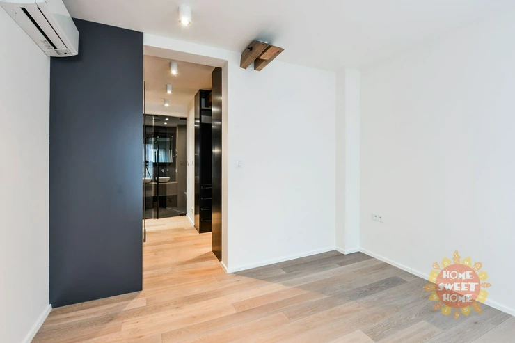 The apartment has an entrance hall, two bedrooms each with a dressing room and a private bathroom (one bathroom with a shower, the other with a bathtub), a living room, a kitchenette fully equipped with modern appliances and a dining area. The apartment uses high-quality materials, oak parquets, designer tiles, gas boiler, security door, wine cellar, air conditioning and washer/dryer available.