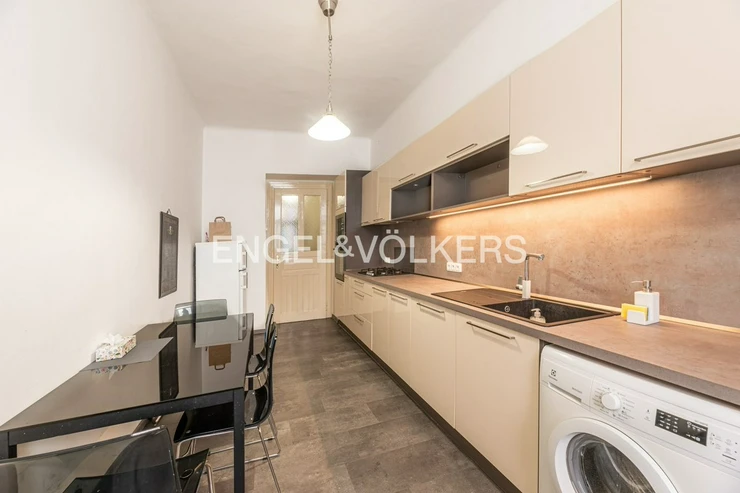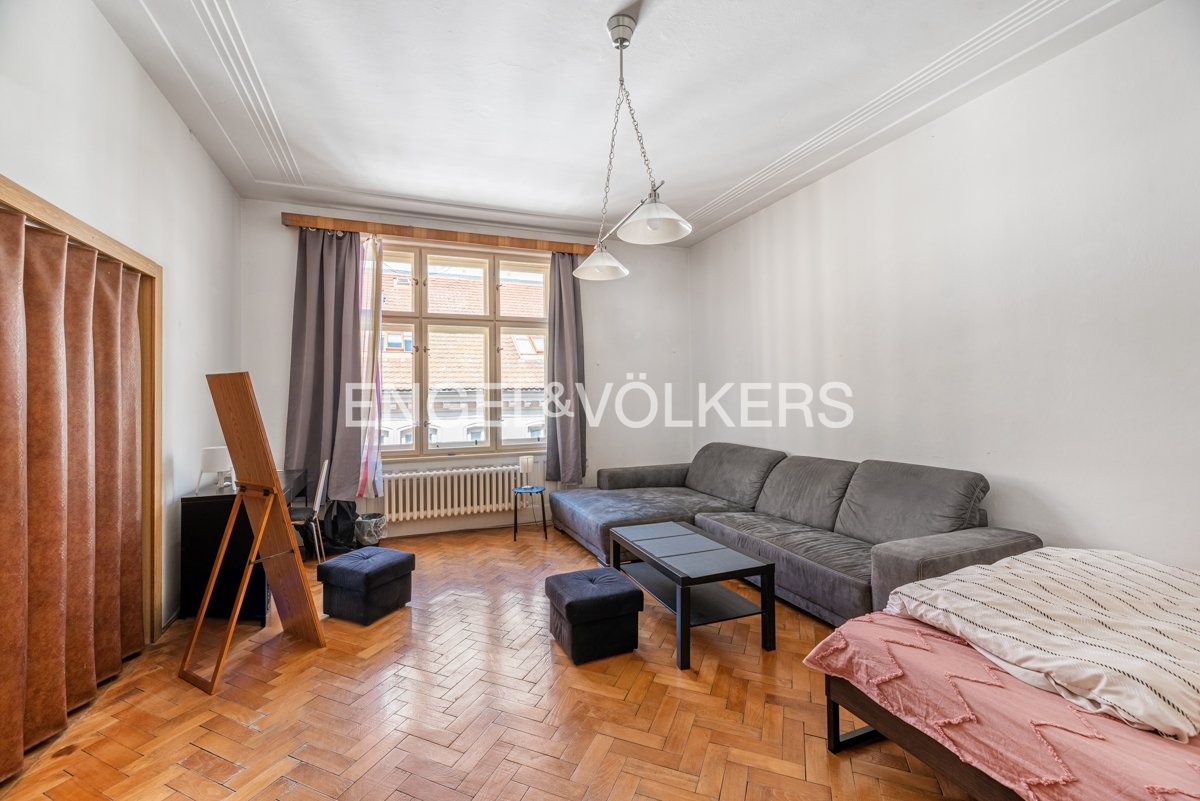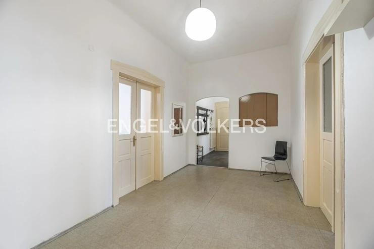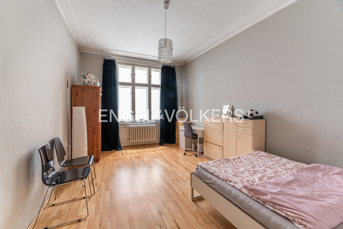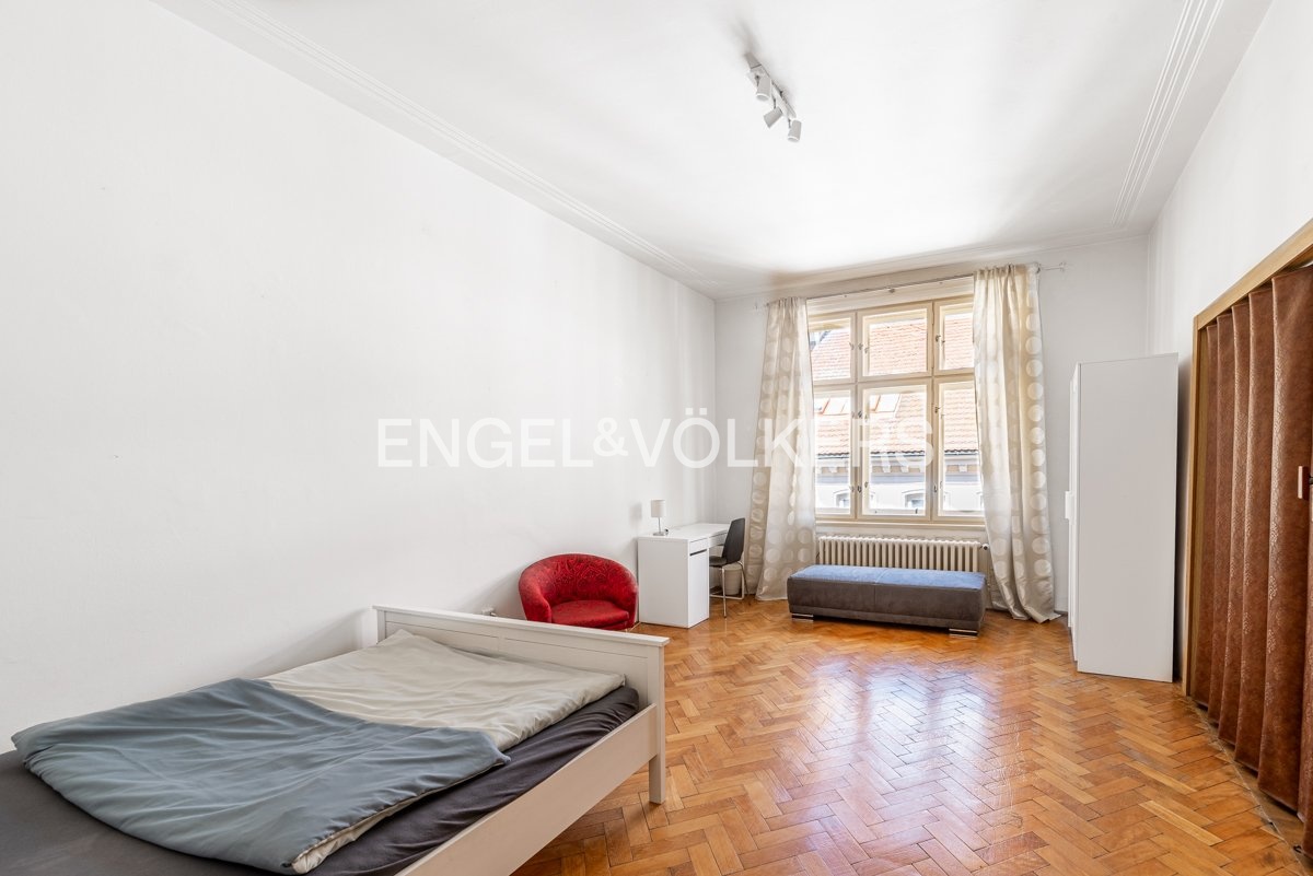 The apartment is on the 4th floor of an apartment building with an elevator. Upon entering the apartment, we enter a small hall from which there is access to a separate toilet and kitchen. The kitchen has been renovated and is fully equipped with all appliances. There is also a pantry and access to a small balcony. Further in the apartment, there is a large hall with access to all four bedrooms, two of which face the courtyard and two face Krakovská Street. The bedrooms have wooden floors.