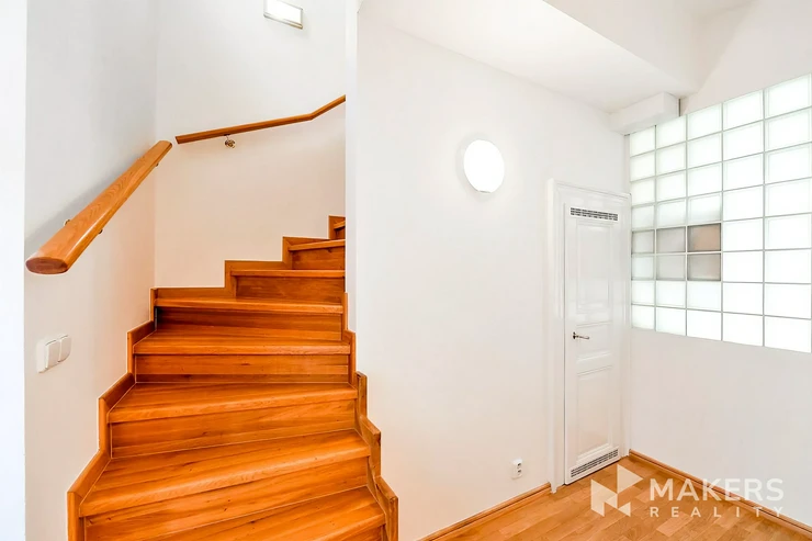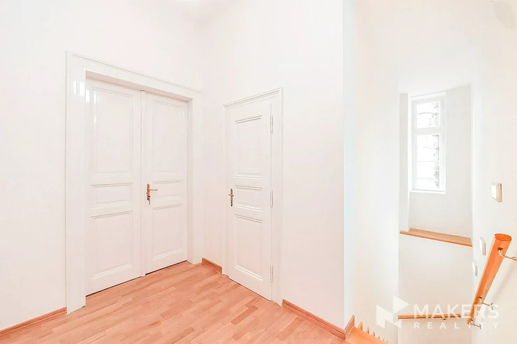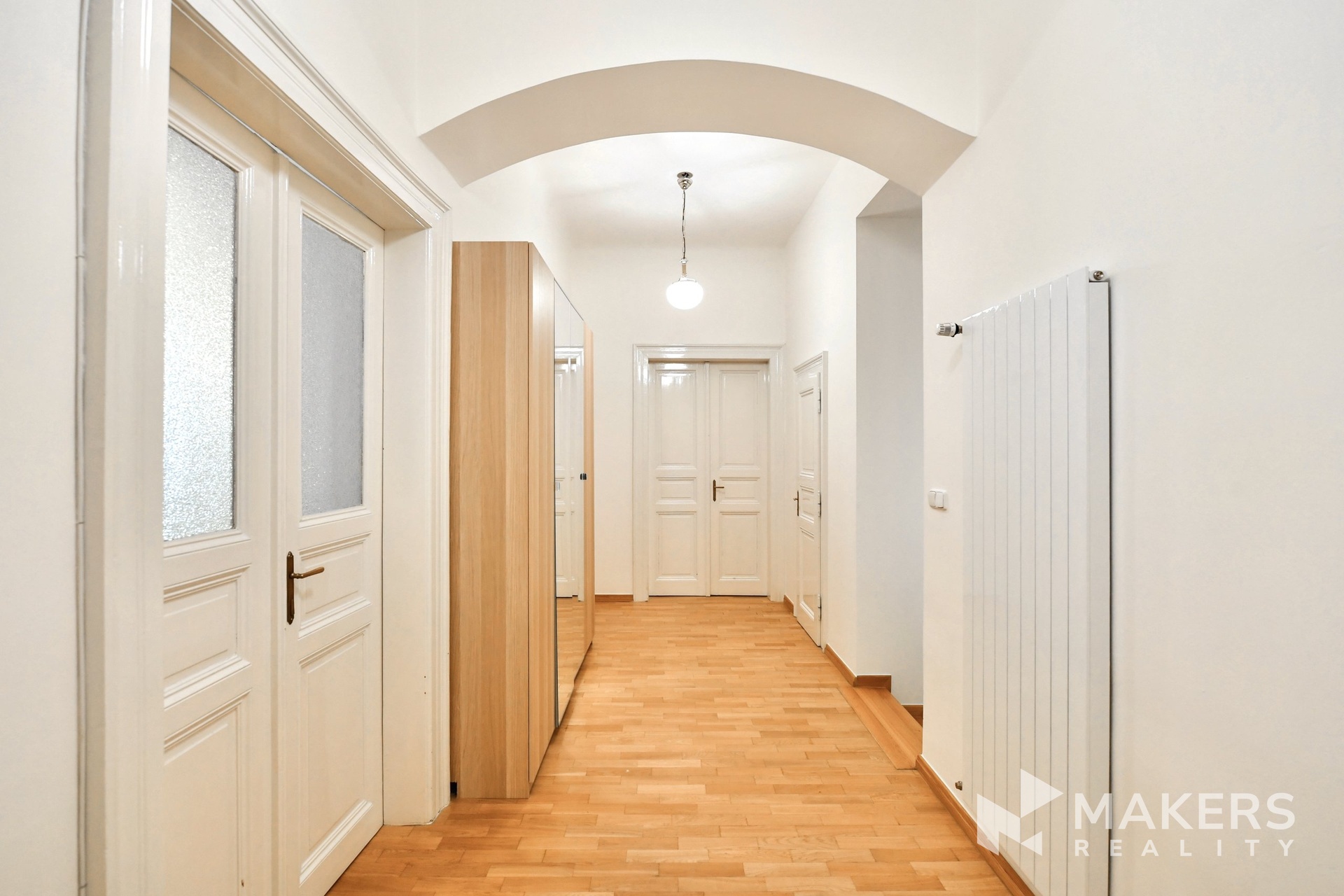 We offer for rent an elegant two-level apartment (3+kk) with a total floor area of 118 m², located on the elevated ground floor and 1st floor of a beautifully renovated Art Nouveau building with an elevator, situated on prestigious Mánesova Street (Mánesova) in the heart of Vinohrady (Vinohrady). The apartment also includes a balcony facing a quiet inner courtyard.