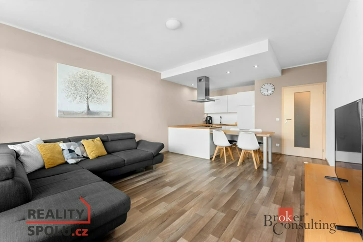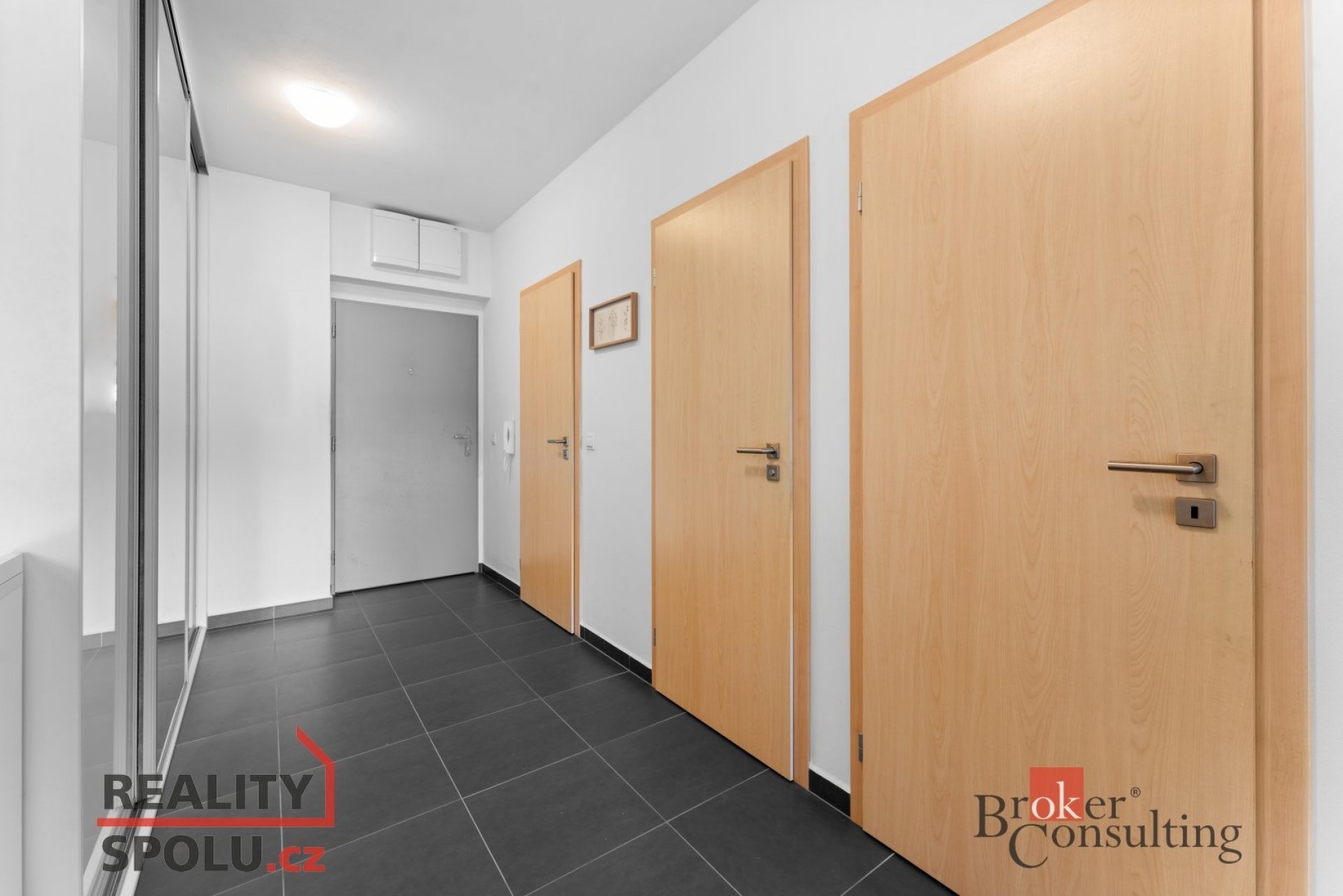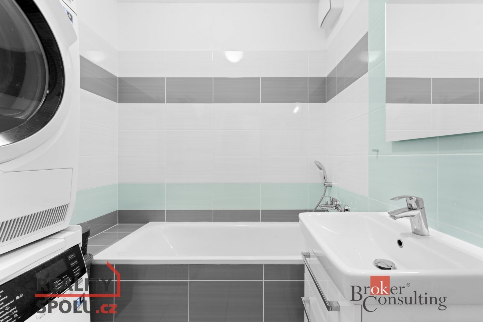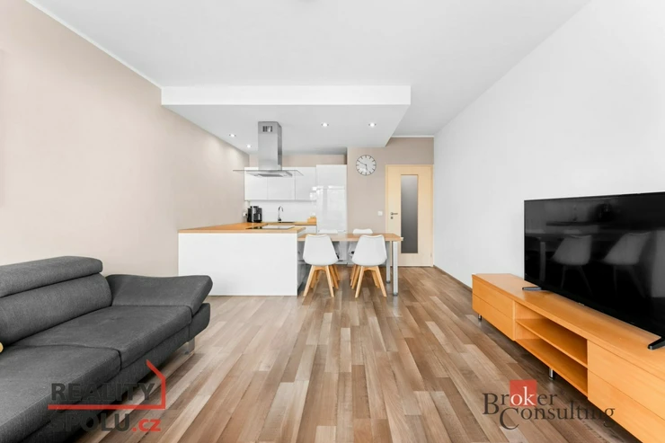 Byt se pronajímá částečně vybaven: kuchyňská linka s vestavěnými spotřebiči včetně myčky, jídelní stůl spojený s kuchyňskou linkou a jídelní židle, vestavěné skříně, koberec a sezení na balkoně. K bytu dále náleží komora v bytě, lodžie se vstupem z obývacího pokoje, sklep a společná kolárna.