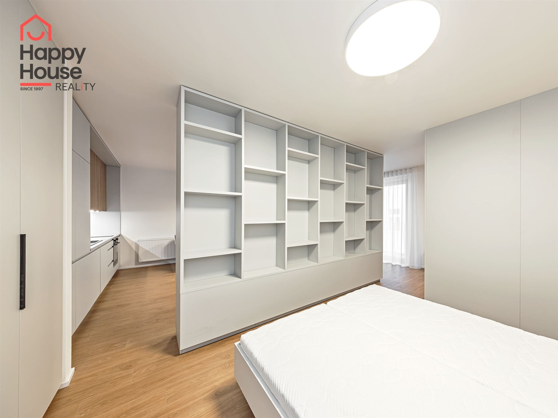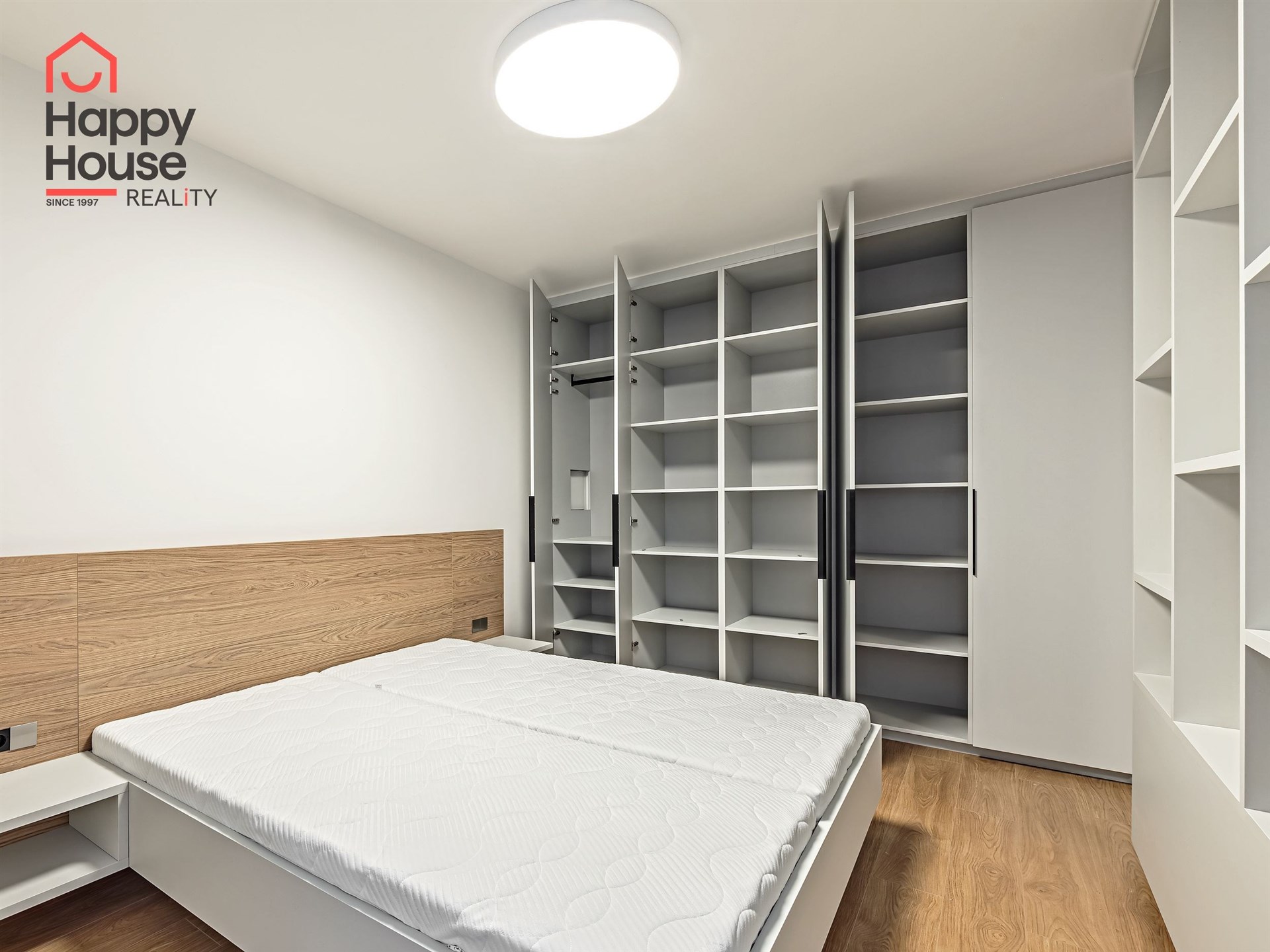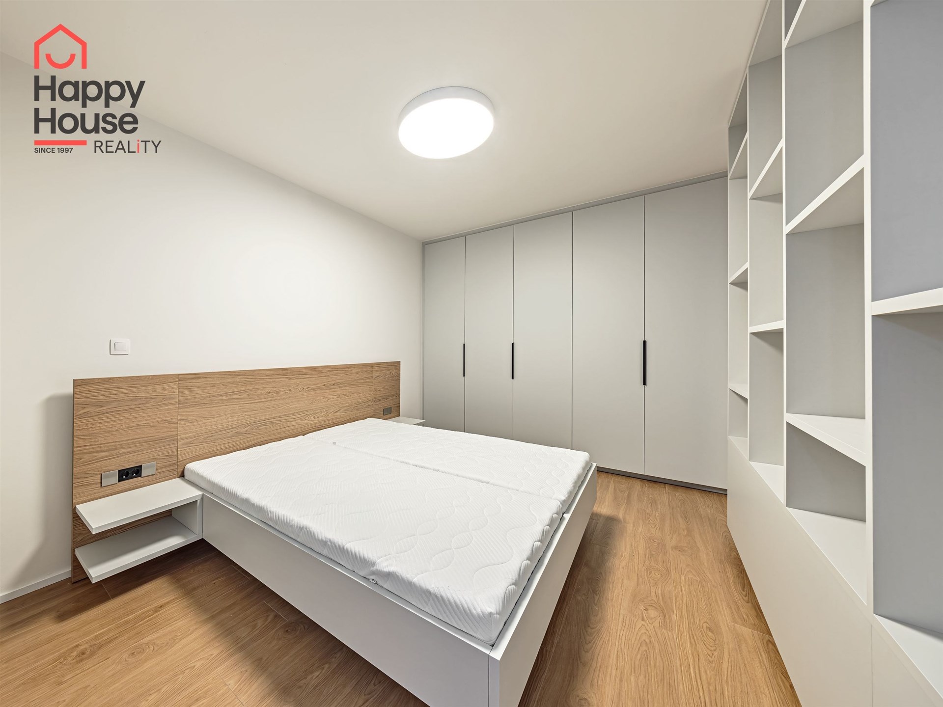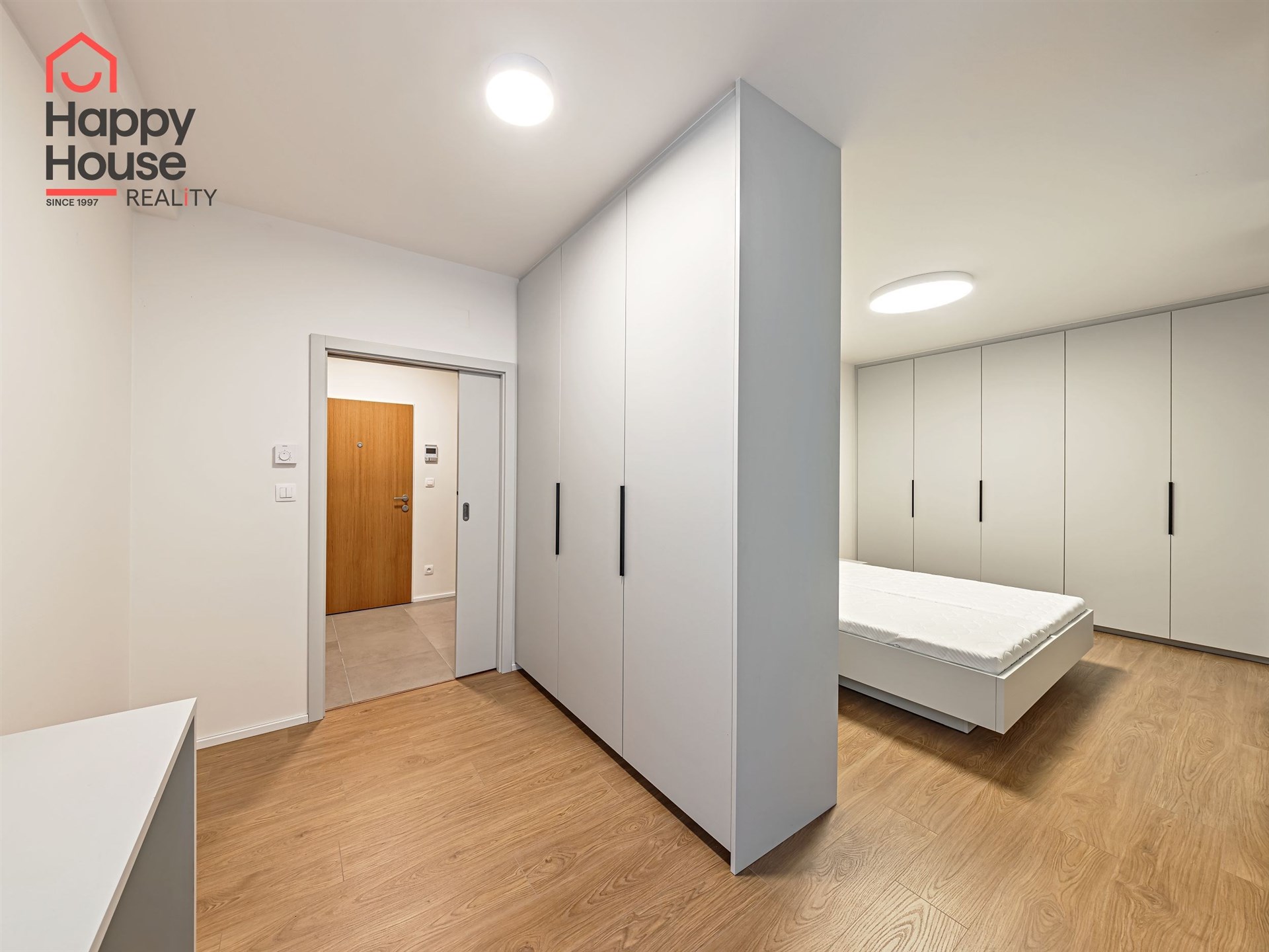 In the optically separated sleeping area, there is a double bed and built-in wardrobes on both sides.