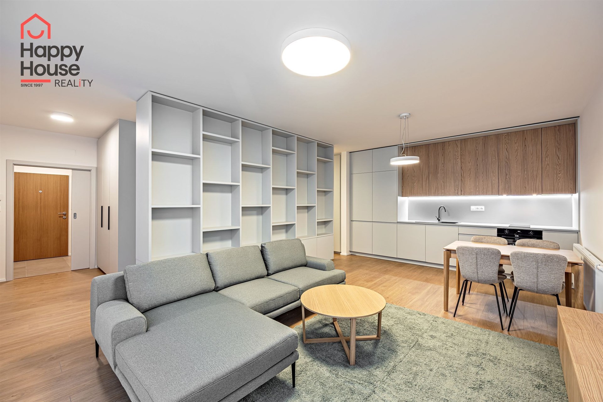 In the living area, there is a sofa, coffee table, TV stand, and a large bookcase separating the sleeping area of the apartment.