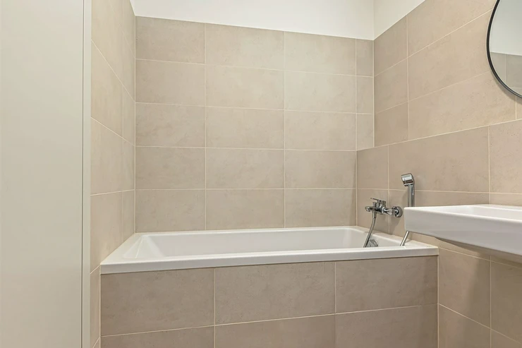 The bathroom comprises a bathtub, toilet, heated towel rail, and preparations for a washing machine. If you do not have your own washing machine, we will gladly purchase one for you.