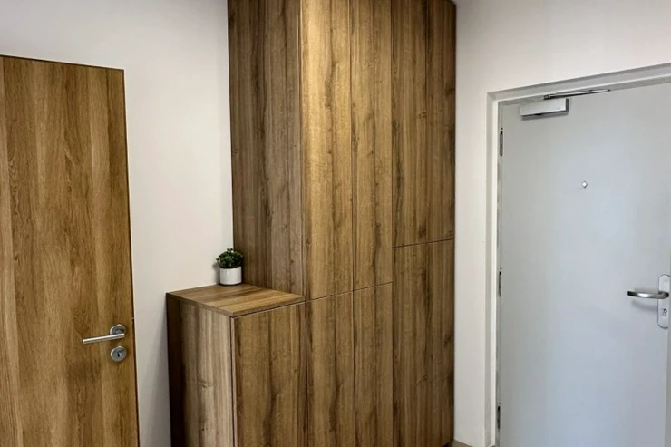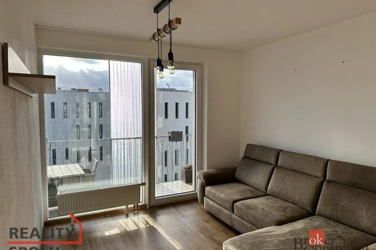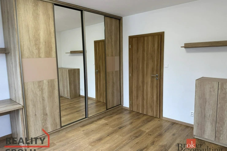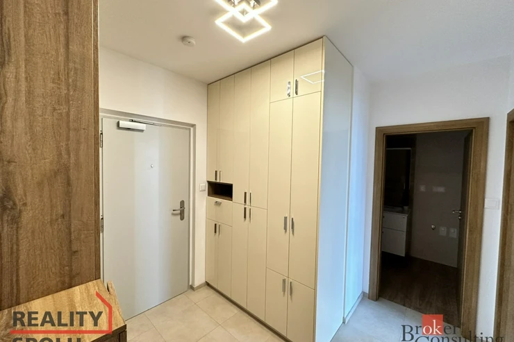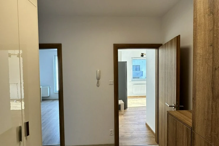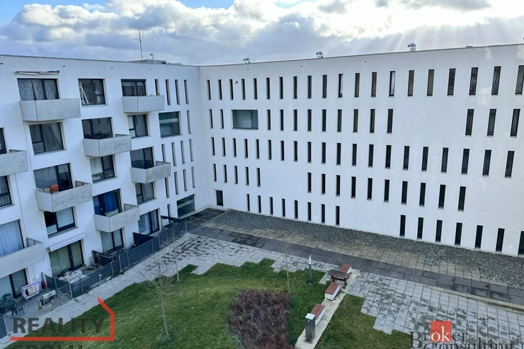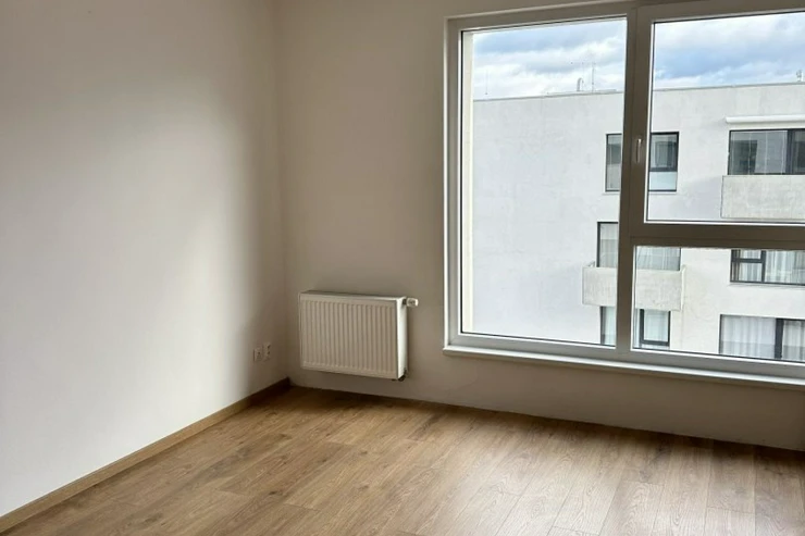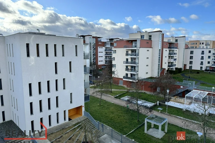 Byt se skládá ze vstupní chodby, krásné koupelny s vanou a toaletou. Další místností je prosluněná ložnice orientovaná na východ s velkorysou vestavnou skříní a psacím stolem. Dále obývací pokoj s kuchyňským koutem. Byt je vybaven kuchyňskou linkou s vestavěnými spotřebiči (indukční varnou deskou, mikrovlnou troubou, horkovzdušnou troubou s funkcí páry a myčkou), volně stojící lednicí. Ve vstupní chodbě jsou dvě velmi prakticky řešené vestavěné šatní skříně. Byt též disponuje prostorným balkonem orientovaným na jih, který si nájemník může pohodlně vybavit dvěma křesly a stolkem, či elektrickým grilem. Výhled z balkonu je do vnitrobloku domu, který je určen pouze pro rezidenty. Vnitroblok je oplocen.