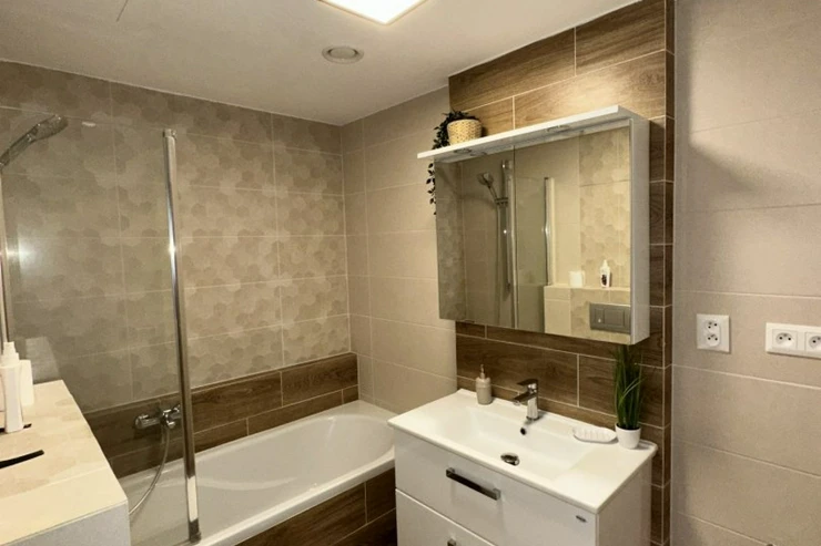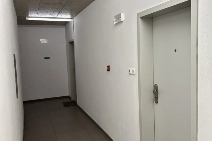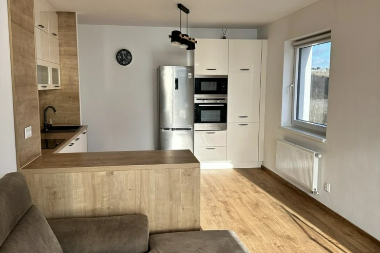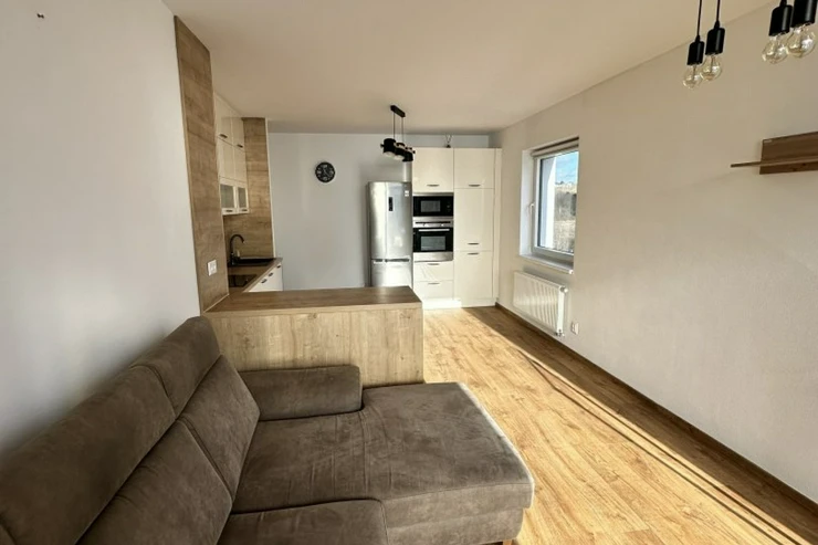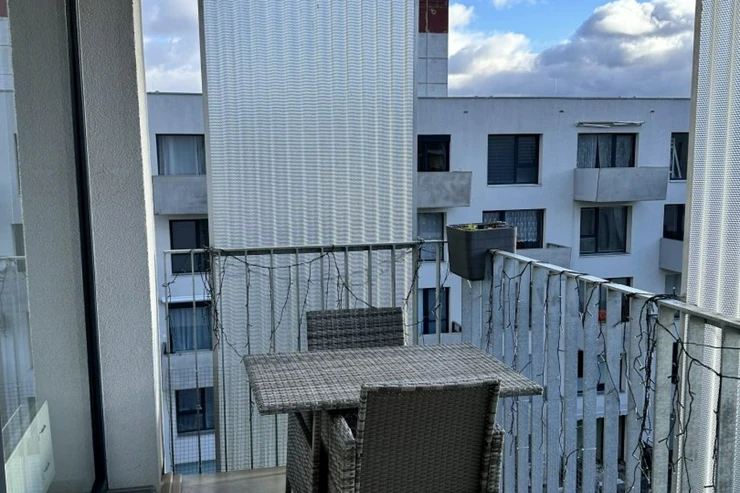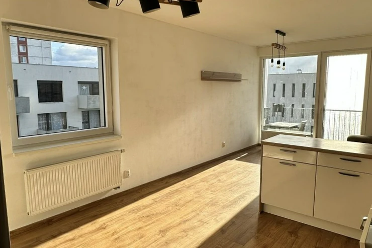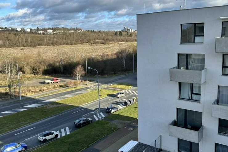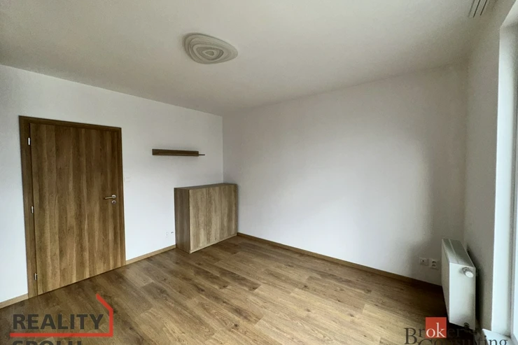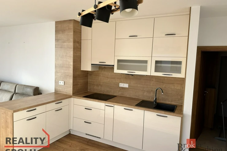 Byt se skládá ze vstupní chodby, krásné koupelny s vanou a toaletou. Další místností je prosluněná ložnice orientovaná na východ s velkorysou vestavnou skříní a psacím stolem. Dále obývací pokoj s kuchyňským koutem. Byt je vybaven kuchyňskou linkou s vestavěnými spotřebiči (indukční varnou deskou, mikrovlnou troubou, horkovzdušnou troubou s funkcí páry a myčkou), volně stojící lednicí. Ve vstupní chodbě jsou dvě velmi prakticky řešené vestavěné šatní skříně. Byt též disponuje prostorným balkonem orientovaným na jih, který si nájemník může pohodlně vybavit dvěma křesly a stolkem, či elektrickým grilem. Výhled z balkonu je do vnitrobloku domu, který je určen pouze pro rezidenty. Vnitroblok je oplocen.