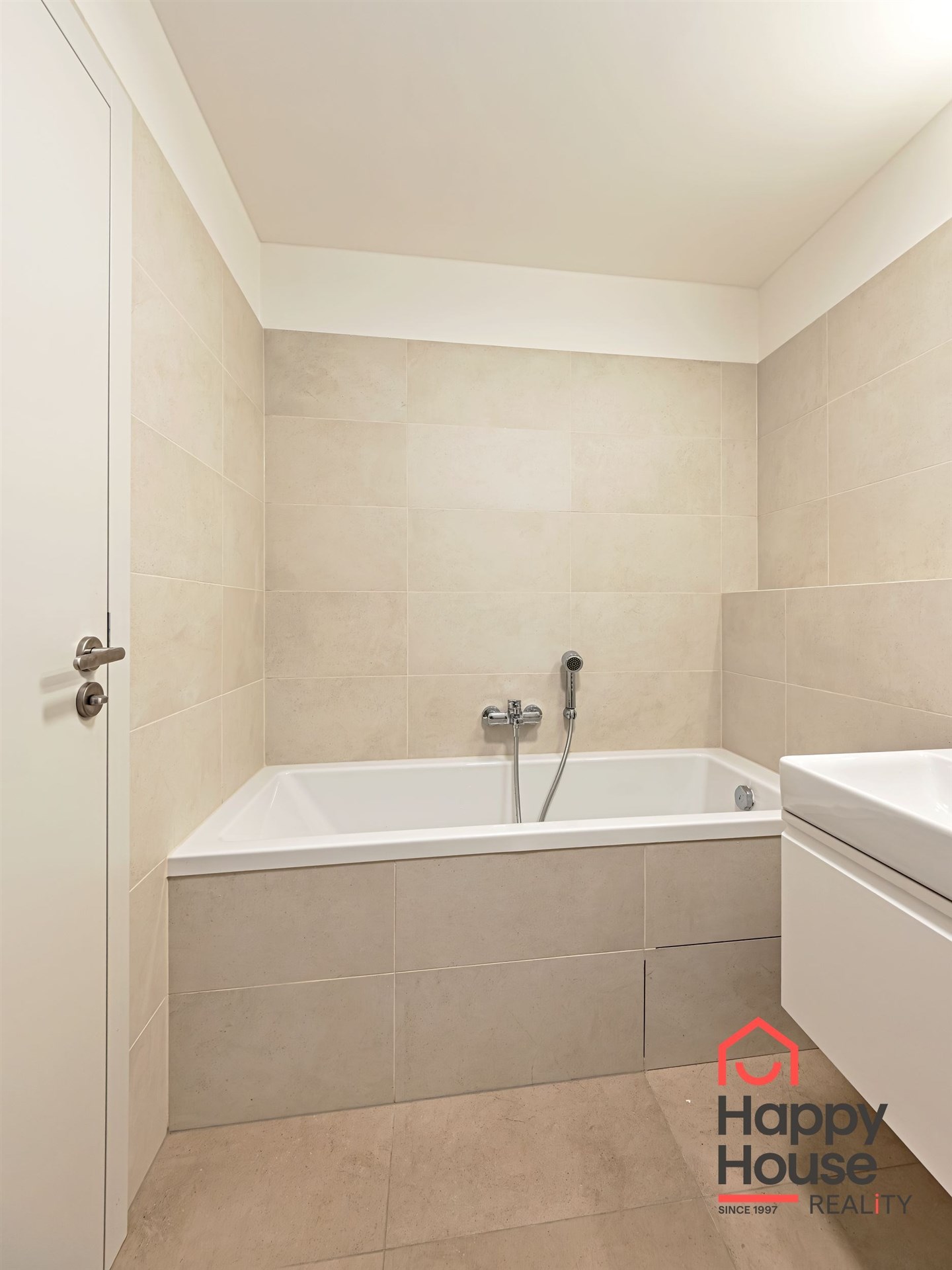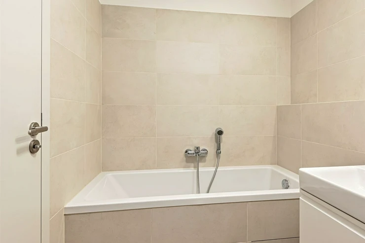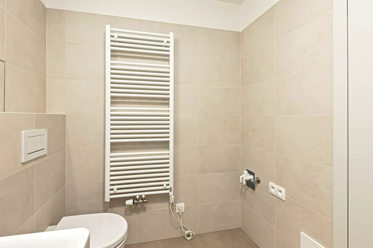 The bathroom is equipped with a bathtub, toilet, heated towel rail, toilet, and preparation for a washing machine.