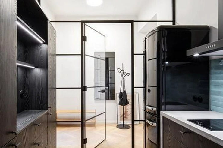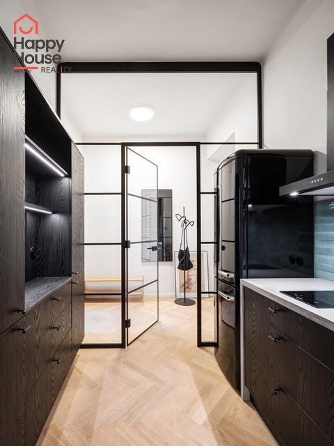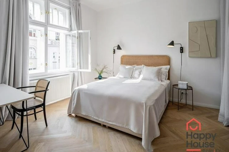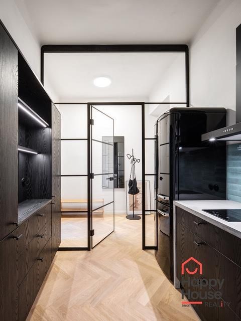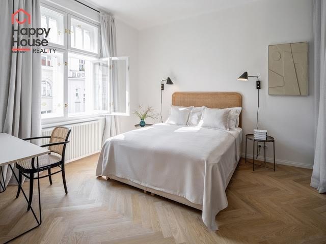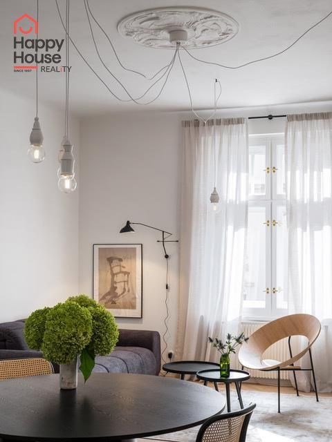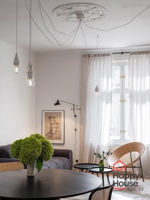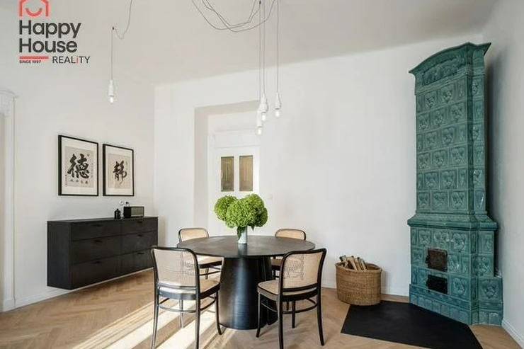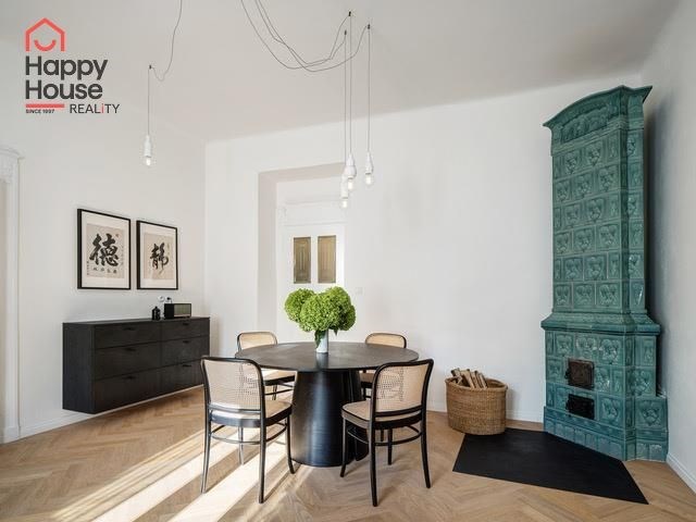 Rental of a modern, spacious one-bedroom apartment with an area of 66 sqm on the 3rd floor of a brick building without an elevator in Prague 6 - Dejvice. The apartment is fully furnished and offers an entrance hall, living room, bedroom, separate dressing room, bathroom, and a fully equipped kitchen. The spacious living room has original and functional tile stoves and a dining area. The kitchen includes kitchen unit, a fridge with freezer, a ceramic hob, and an extractor hood. The bathroom is equipped with a shower and a toilet. A washer-dryer is available. An electric boiler provides heating and hot water. A security system is included in the apartment. Street parking - zones.