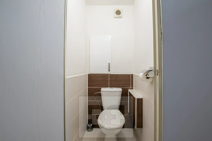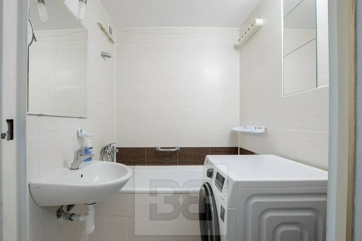 The bathroom is equipped with a bathtub, sink, and washing machine. The toilet is separate. The entrance hall is spacious and offers several built-in storage areas, providing plenty of room for coats, shoes, and other household items. The apartment also includes a glazed loggia, providing a pleasant space for sitting or drying laundry.