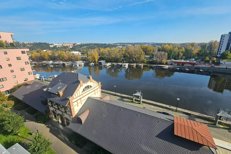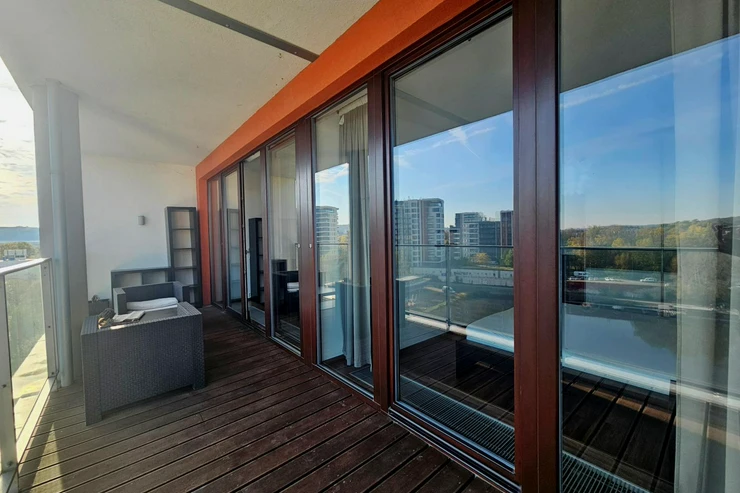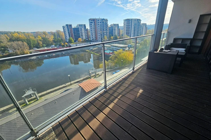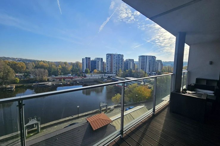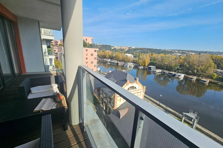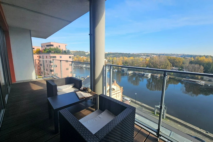 Velkorysý balkón přístupný z obou místností s úchvatným výhledem na Vltavu.