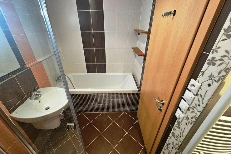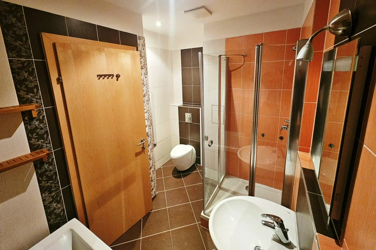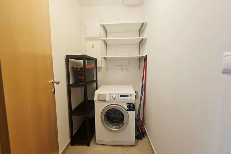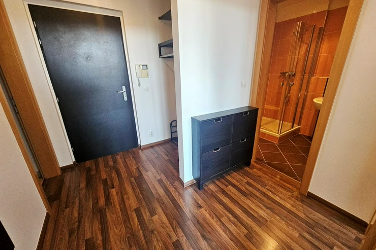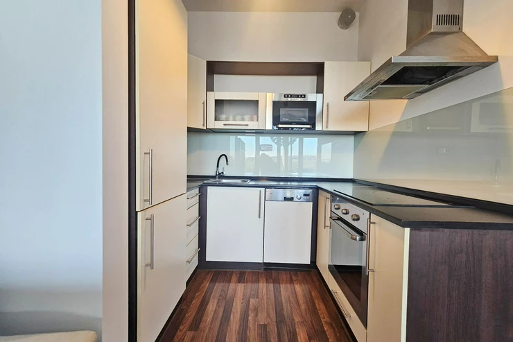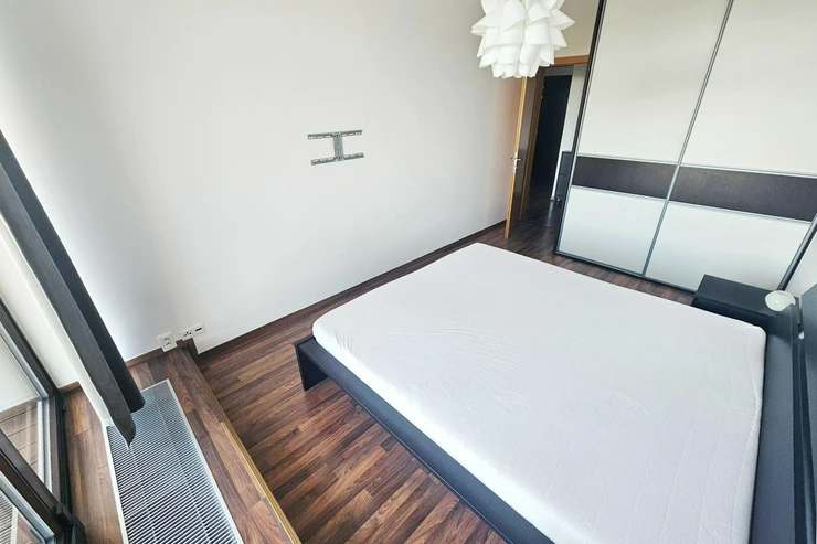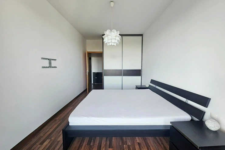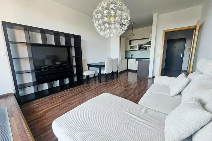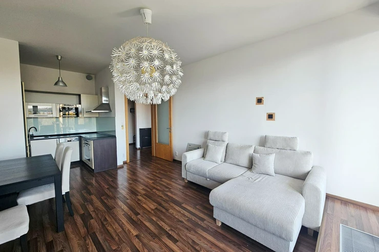Byt se nachází v moderním bytovém komplexu v těsné blízkosti řeky Vltavy. Byt je zařízený. Obývací pokoj s kompletně vybavenou kuchyňskou linkou (trouba, varná deska, myčka, lednice s mrazákem, mikrovlnná trouba), TV a prostorný regál s úložným prostorem. Dále sedačka a jídelní stůl. Samostatná ložnice s manželskou postelí a vestavěnou skříní. Koupelna s vanou. K dispozici komora s pračkou. Prostorná předsíň s botníkem.
