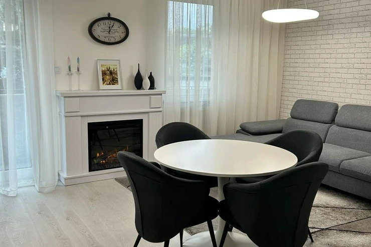 The interior is thoughtfully designed and equipped with everything needed for comfortable living. The open-plan living area features a modern kitchenette with appliances including electric oven, dishwasher, stove, fridge, electric kettle. There is a dining area with a table and four chairs, a comfortable corner sofa bed, a television, and a stylish electric fireplace that adds a cozy touch to the space.
