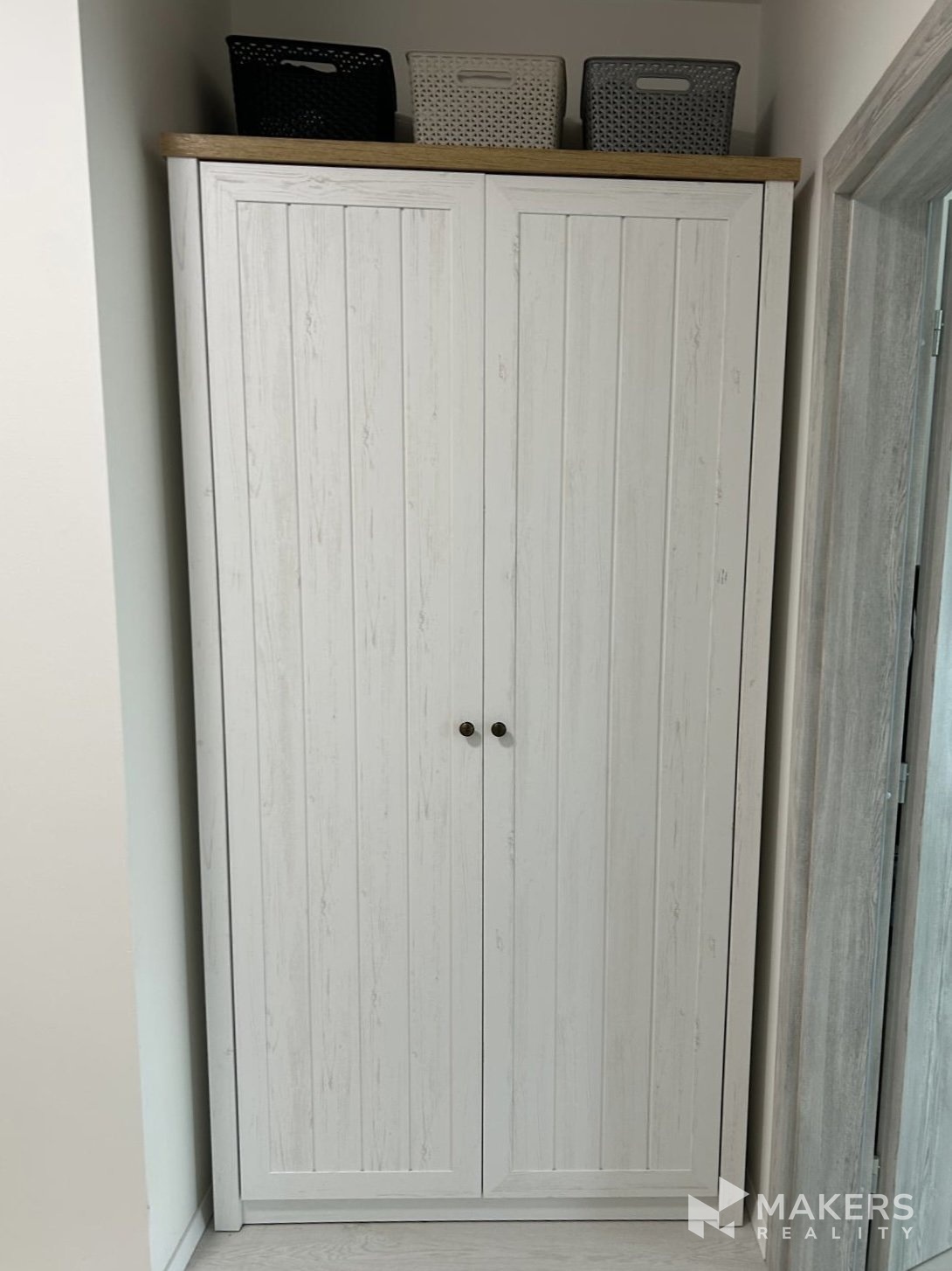 In the hallway, there is a wardrobe, a chest of drawers, a full-length mirror, and a shoe rack — providing ample storage space. The bathroom is fitted with a shower, a washing machine, and storage cabinets. One of the highlights of the apartment is the spacious balcony with outdoor seating and a view of greenery — perfect for morning coffee or relaxing in the evening.