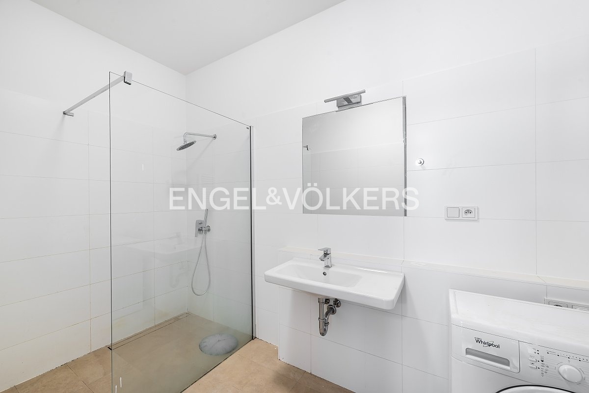 The apartment features a bright living room with beautiful stucco ceilings and a fully equipped kitchen with Siemens appliances. It also includes a spacious bedroom facing the street and a bathroom with a shower, washing machine, and toilet.
