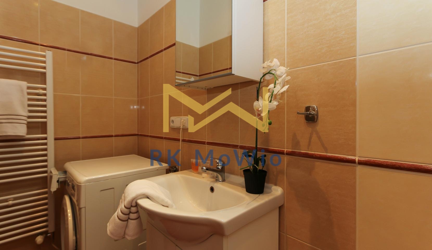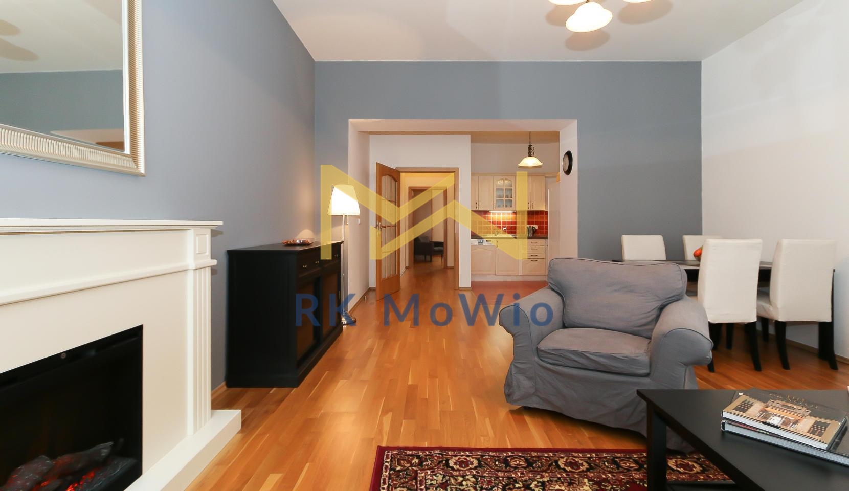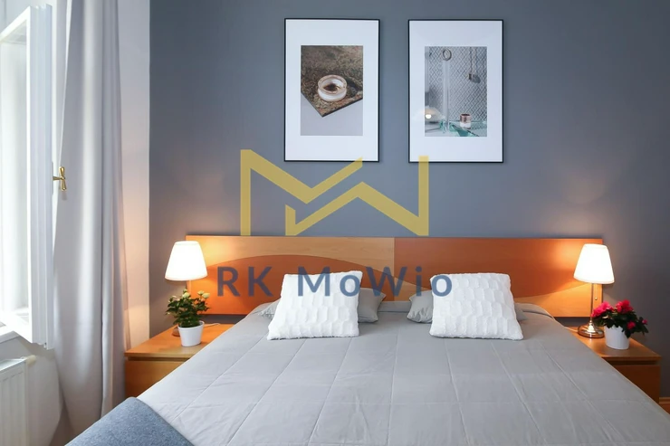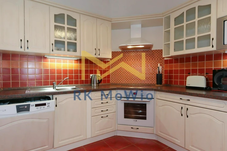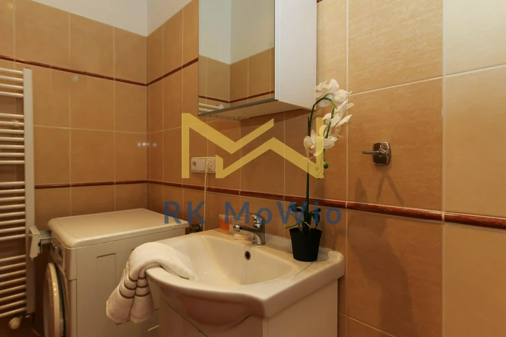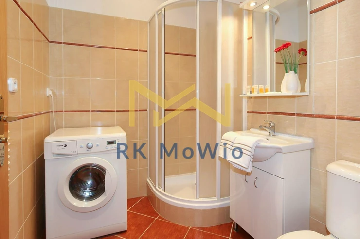 The unit features an entrance hall, a spacious living room with a fireplace, a kitchenette with dining area, a master bedroom, a second bedroom, one bathroom (with shower and washbasin) and a separate toilet. Additional equipment includes: kitchen unit with fridge-freezer, ceramic hob, extractor hood, electric and microwave oven; built-in wardrobes, washing machine, high-speed internet preparation, wooden floors and tiles. Parking space available for an extra fee.