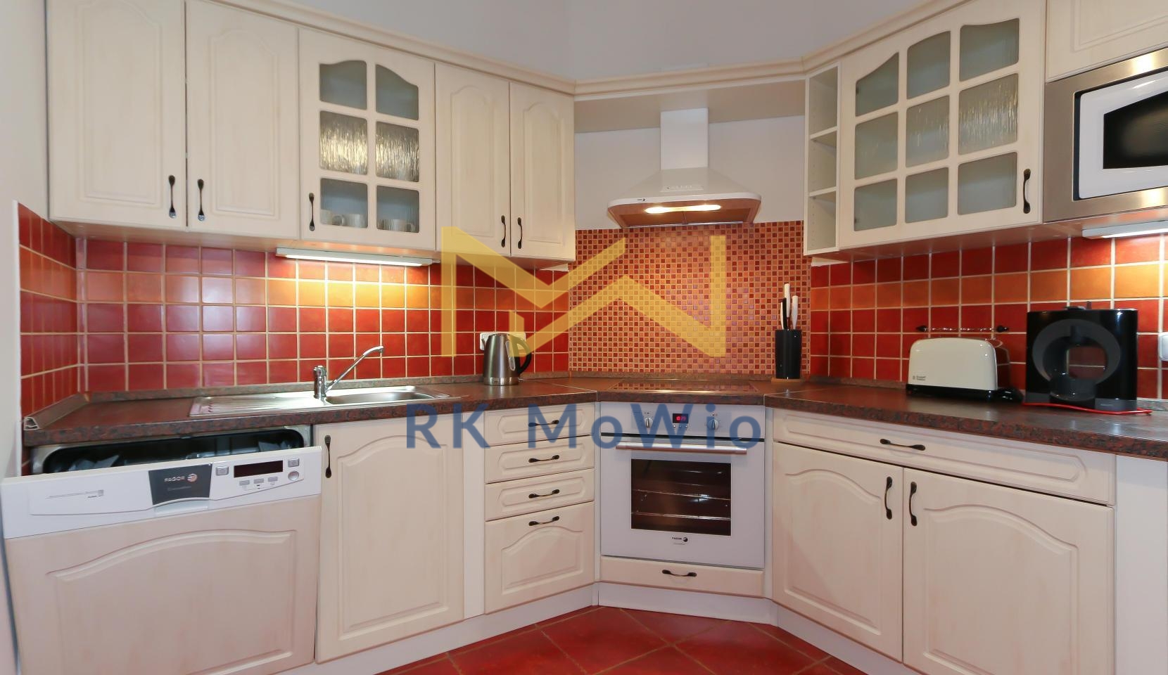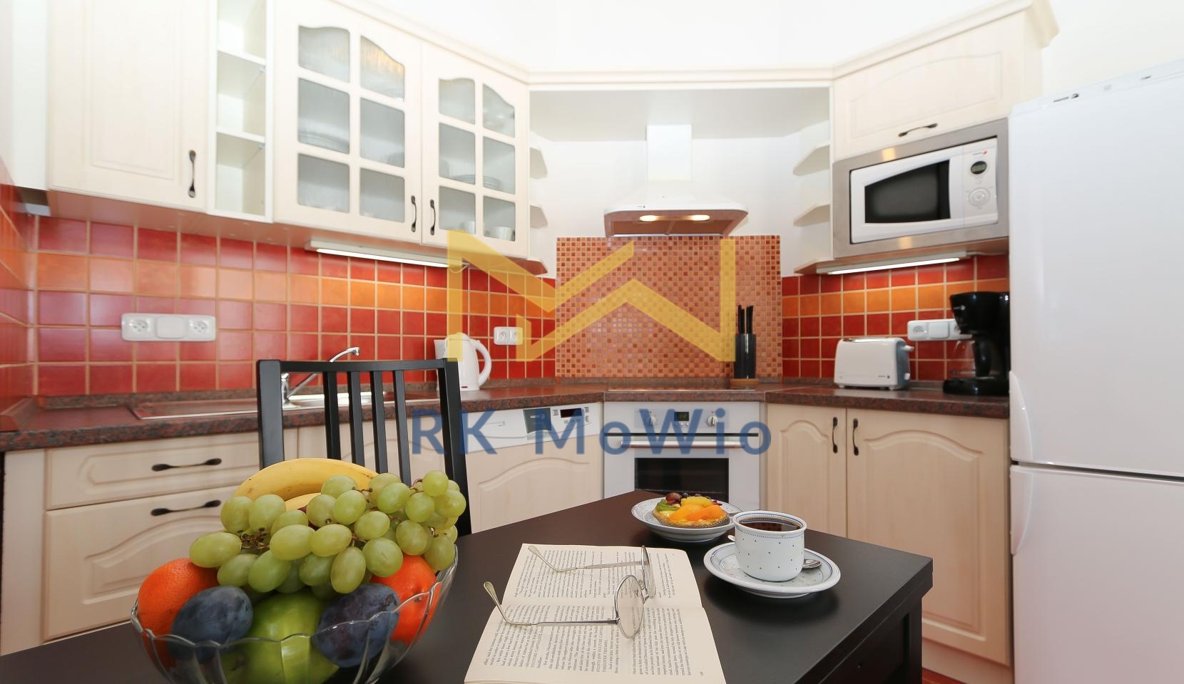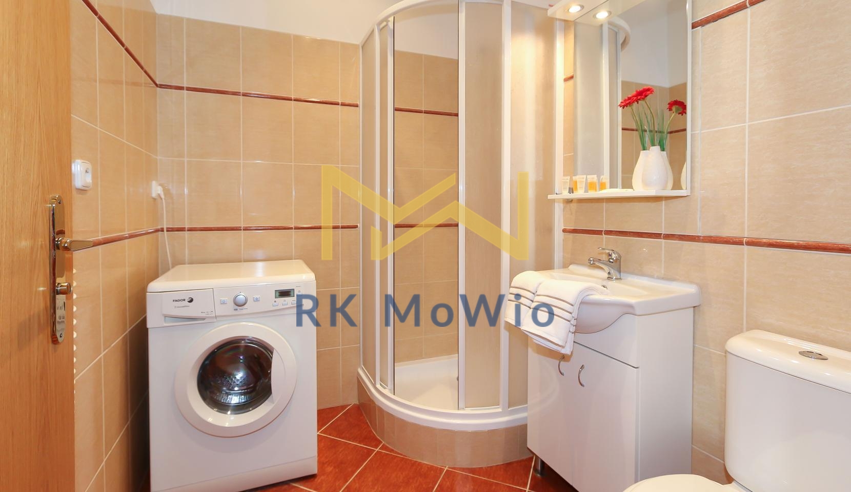 The unit features an entrance hall, a spacious living room with a fireplace, a kitchenette with dining area, a master bedroom, a second bedroom, one bathroom (with shower and washbasin) and a separate toilet. Additional equipment includes: kitchen unit with fridge-freezer, ceramic hob, extractor hood, electric and microwave oven; built-in wardrobes, washing machine, high-speed internet preparation, wooden floors and tiles. Parking space available for an extra fee.