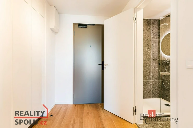 Úsporné LED smart osvětlení v celém bytě, vestavná skříň v chodbě a stylová koupelna s moderním designem. Byt má energetický štítek B, což zajišťuje nízké provozní náklady.