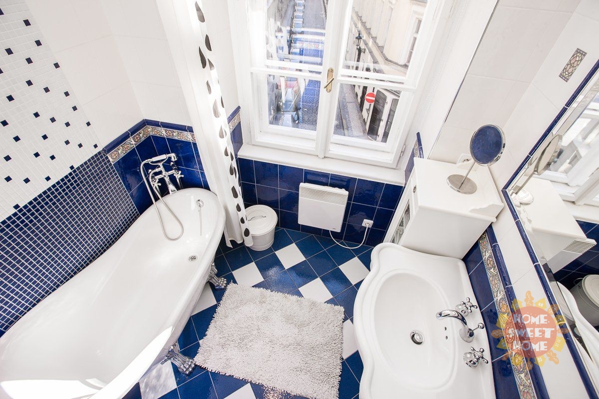 The apartment is fully furnished. The kitchen is equipped with a ceramic cooktop, electric oven, dishwasher, refrigerator with freezer, and kitchenware. The elegant bathroom features a unique bathtub. A washing machine and dryer are also available. The toilet is separate. Wooden parquet floors and tiles throughout the apartment. Window blinds are installed.