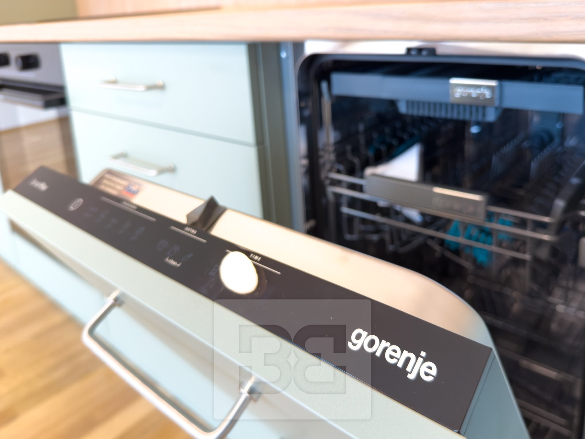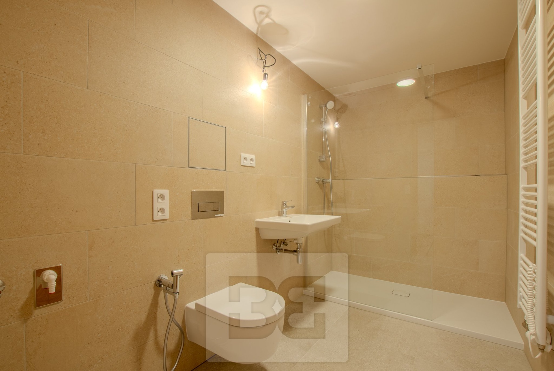 The apartment faces west, providing a pleasant atmosphere and plenty of natural light. The layout consists of a living room with a modern fitted kitchen (including a refrigerator, dishwasher, oven, induction hob, and extractor hood), a spacious bathroom with a shower and toilet. The bathroom is further equipped with a bidet shower, heating ladder, and a designated space for a washing machine and dryer. A cellar unit of 1.8 m² also belongs to the apartment.
