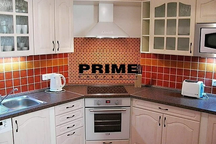 The property comprises: an entrance hallway, a living room with a dining area and a fully fitted kitchen corner with appliances (electric cooking hobs, oven, refrigerator and a dishwasher plus an electric kettle, toaster, pots, pans, dishes and kitchen utensils), two bedrooms, a bathroom (with a bathtub, sink and a washing machine) and a separate WC.