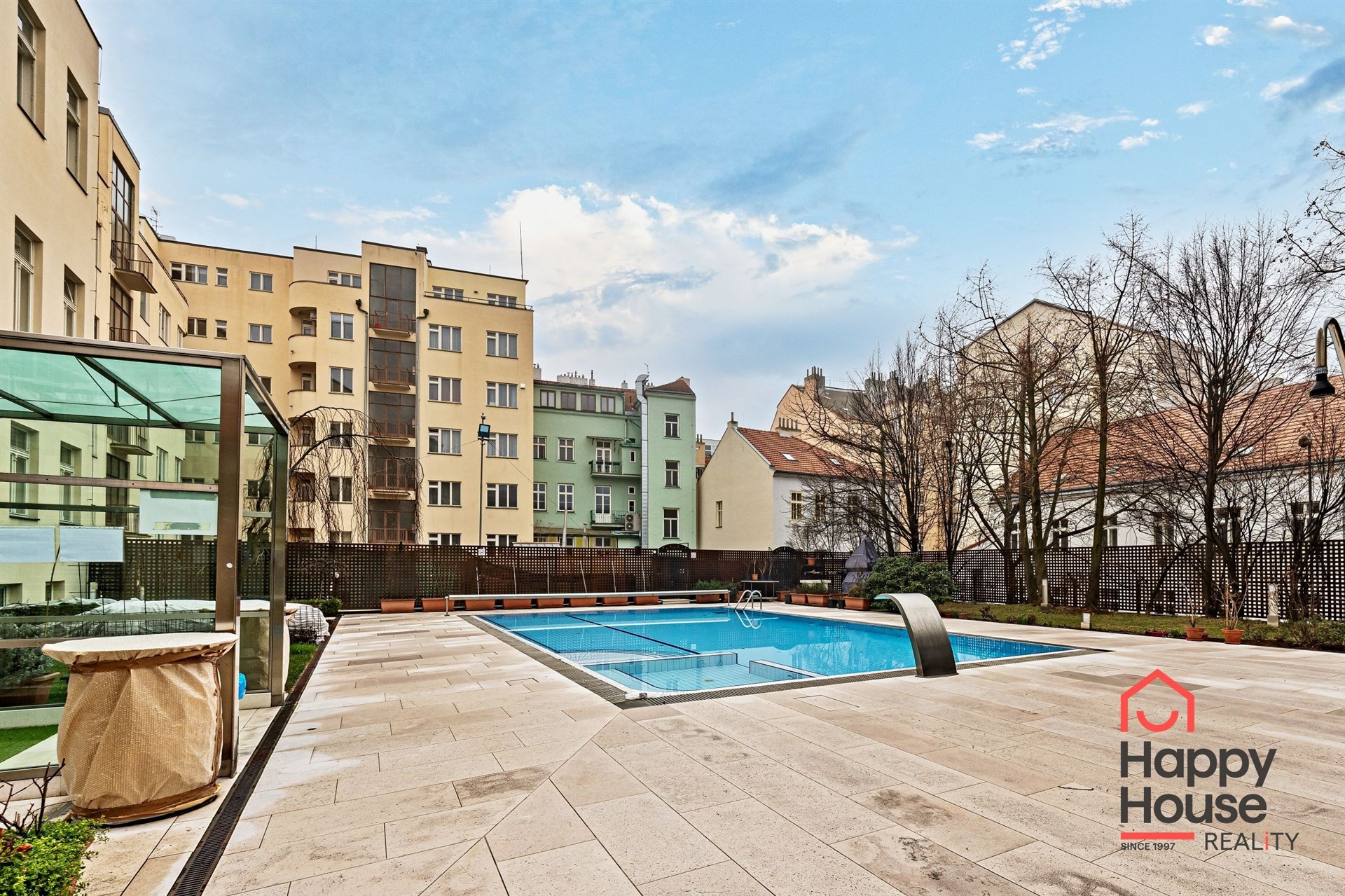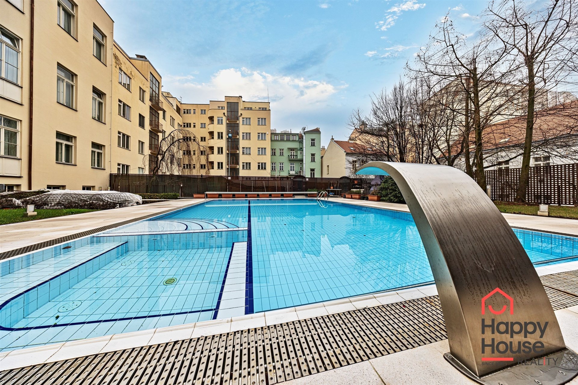 Heated outdoor pool with massage and garden