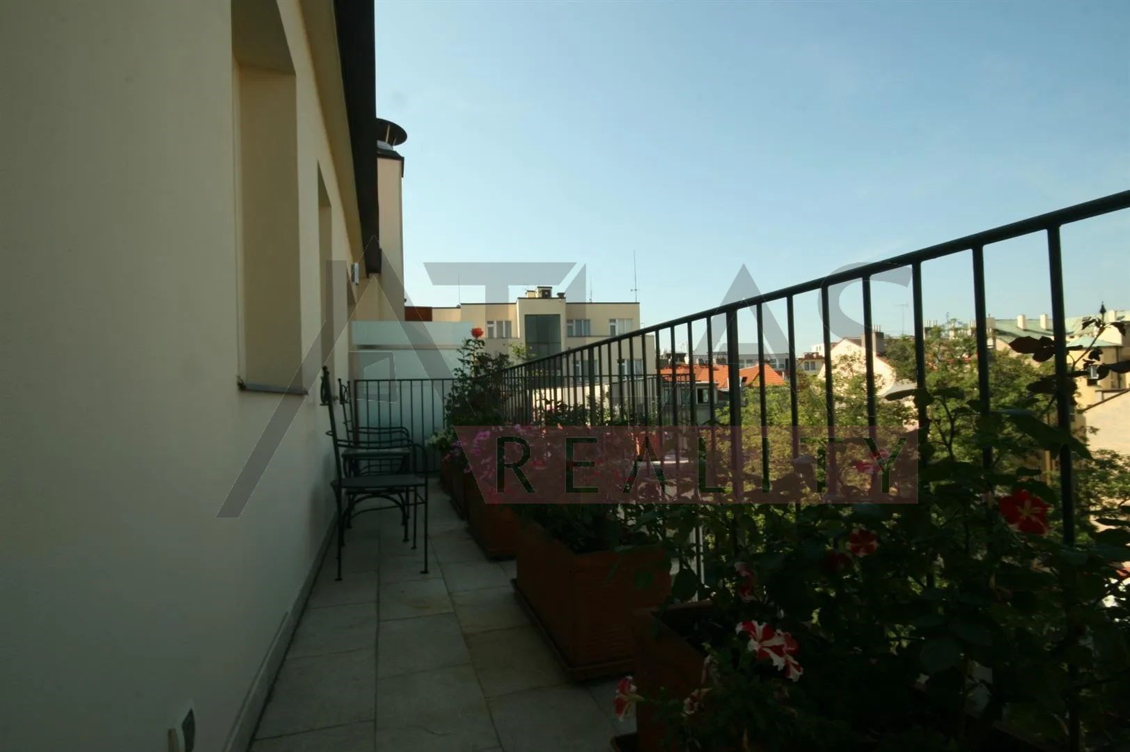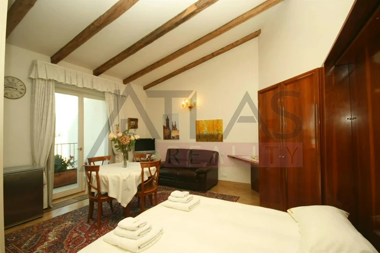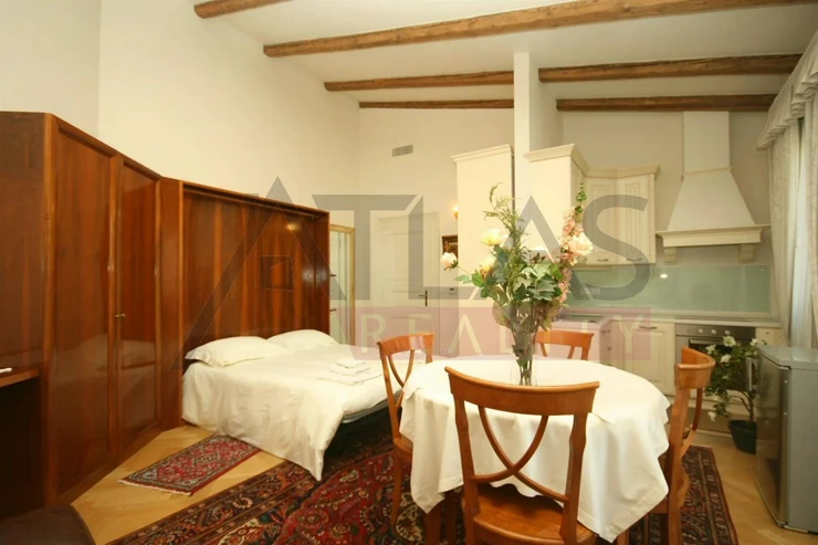Rent of a fully furnished luxury studio apartment of 38 m2 located on the 4th floor with an elevator in a prestigious classic Art Nouveau building featuring high ceilings and original decoration after a complete renovation in 2006. The building is situated in a residential area of the historic center of Prague, just 200 meters from Riegrovy Sady park, 300 meters from the Náměstí Míru metro station on the "A" line, and 500 meters from Wenceslas Square - Museum metro station lines A and C, and the shopping and cultural center of Prague. The apartment is furnished with antique-style Italian furniture. The lower floor features a 28 m2 living room with a kitchenette equipped with a refrigerator, freezer, dishwasher, gas stove, hood, bathroom with sink, corner bathtub, toilet, and bidet, and the apartment has a 4 m2 terrace accessible from the room. The apartment includes a telephone line, high-speed internet, TV, satellite, parquet floors, and tiling, and high-standard materials were used during the renovation. The building has underground garages, an elevator, a large 8 x 11 m swimming pool in the courtyard, 1.2 meters deep with a whirlpool corner, surrounded by a terrace and greenery. There is also a camera system, security, and a building manager. Fees including utilities approximately 450 EUR.