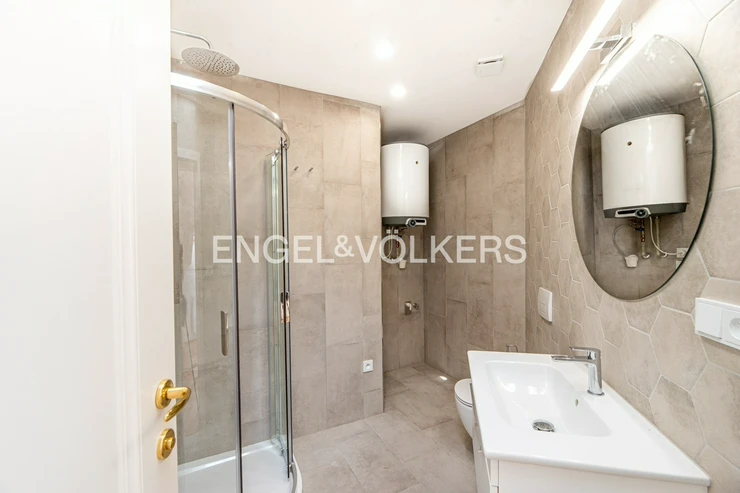 The apartment consists of an entrance hall, a bathroom with a shower, and a practical storage room next to the kitchen. Upon agreement, the apartment can be retrofitted with wardrobes. The high standard of finish of the apartment includes oak parquet flooring, air conditioning units, underfloor heating in the bathroom, and control of lights and heating via an app.