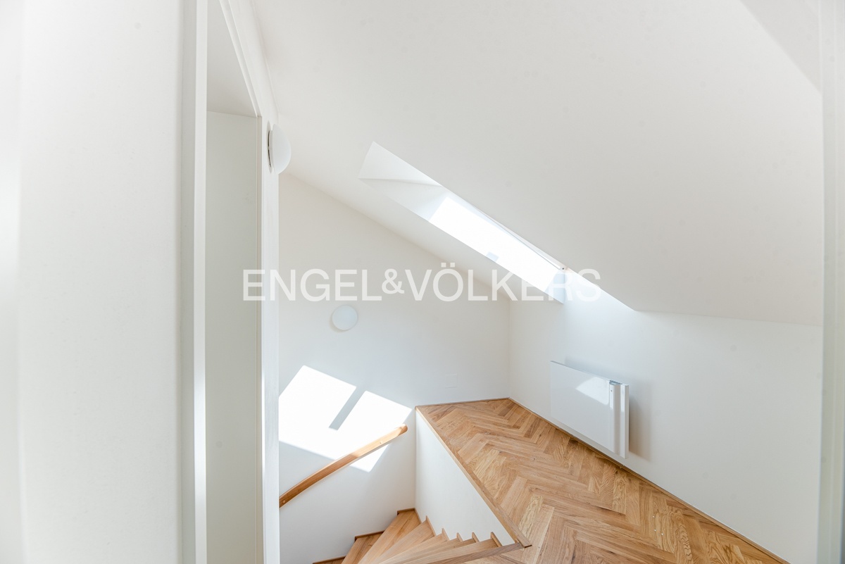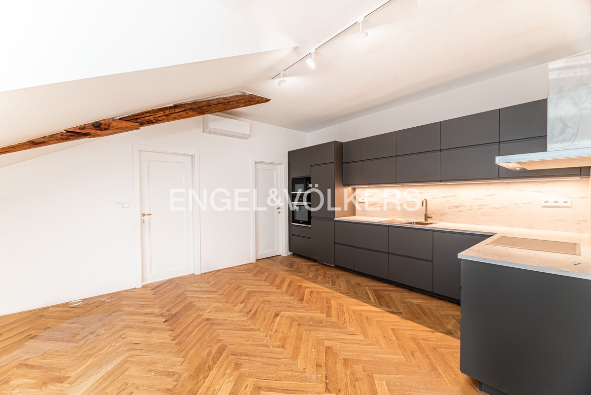 Attic apartment 2+kt with preserved wooden beams on the 2nd floor of a historic apartment building. The living room is connected to the kitchenette, which has all appliances.