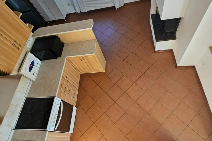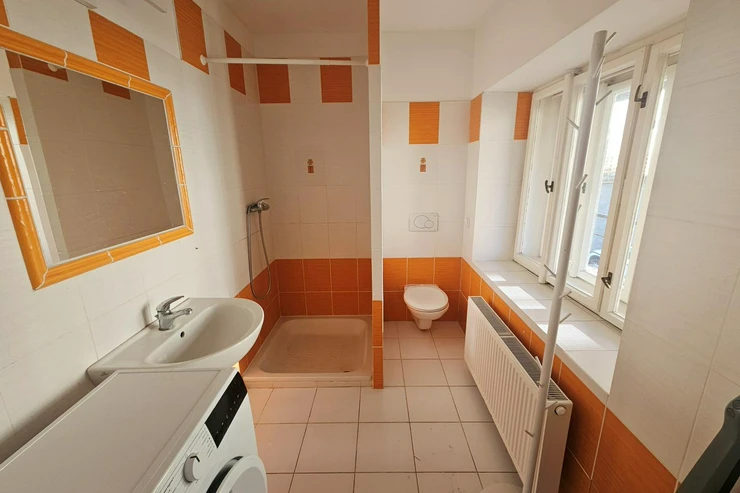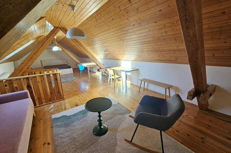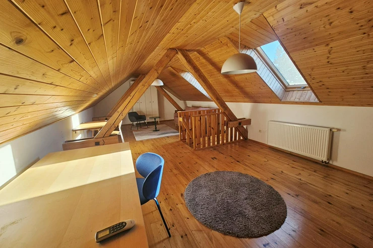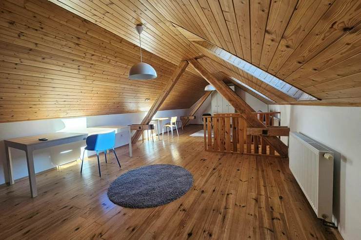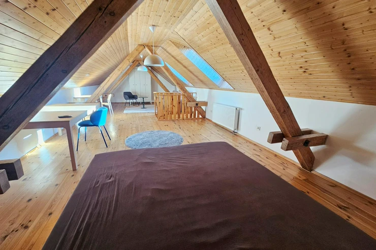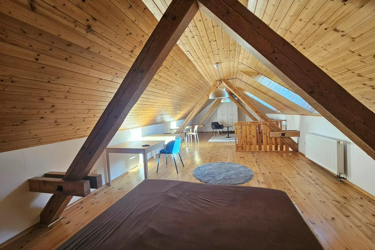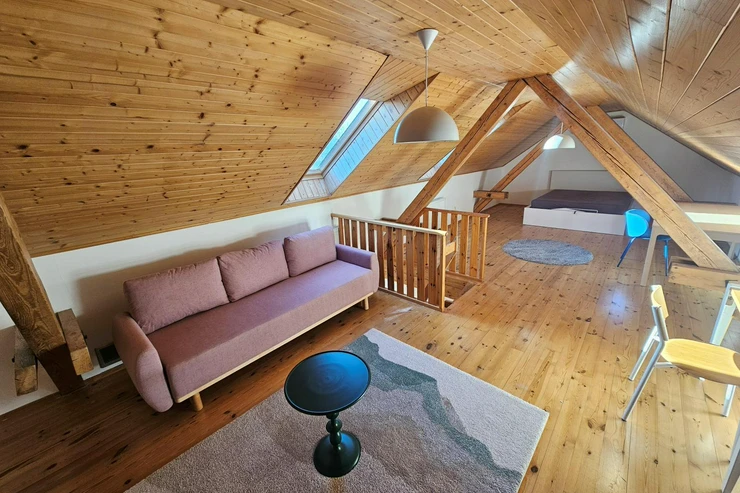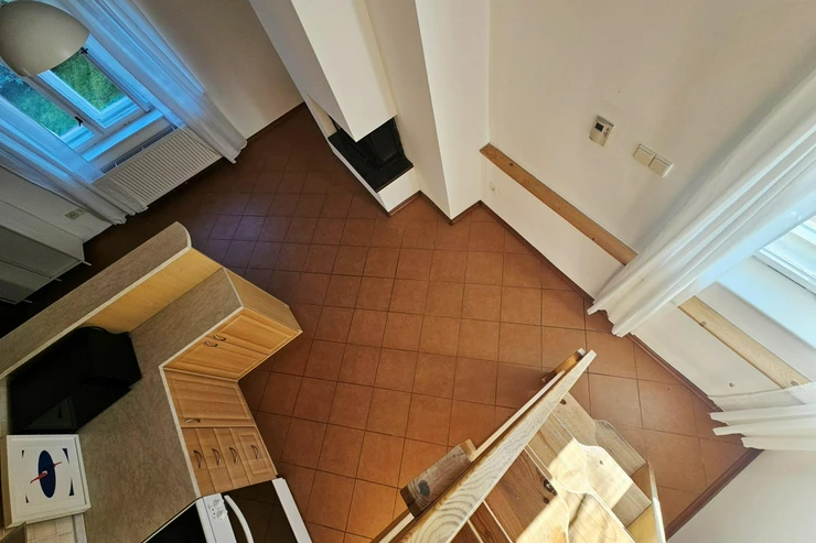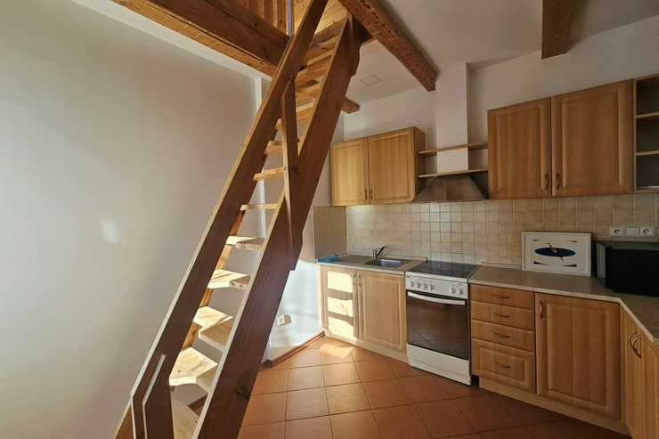 Byt je světlý, útulný a nachází se v klidném rodinném domě s vlastním vstupem. V bytě se nachází spodní a horní část. Dolní část sestává z kuchyňského koutu, obývací části a koupelny. Podkrovní část vyniká prostorem a díky dřevěným trámům a velkým oknům působí velmi vzdušně a útulně. Lze využít jako velká otevřená ložnice spojená s kanceláří či relaxační částí. V koupelně je vana i sprchový kout. WC je zvlášť. Topení elektrické.