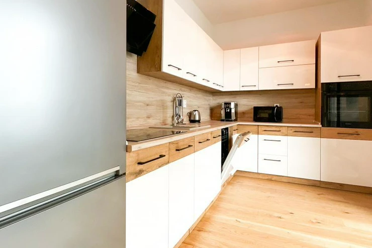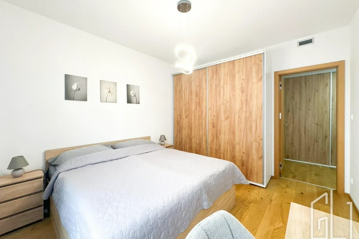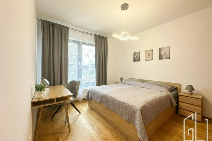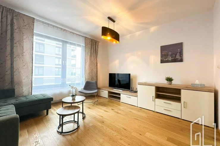 Byt nabízí plně vybavenou ložnici s postelí a šatní skříní, prostorný obývací pokoj s výstupem na balkon, kompletně vybavenou kuchyň s troubou, mikrovlnkou, lednicí s mrazákem a sporákem, koupelnu se sprchovým koutem a pračkou, a předsíň s velkým úložným prostorem.