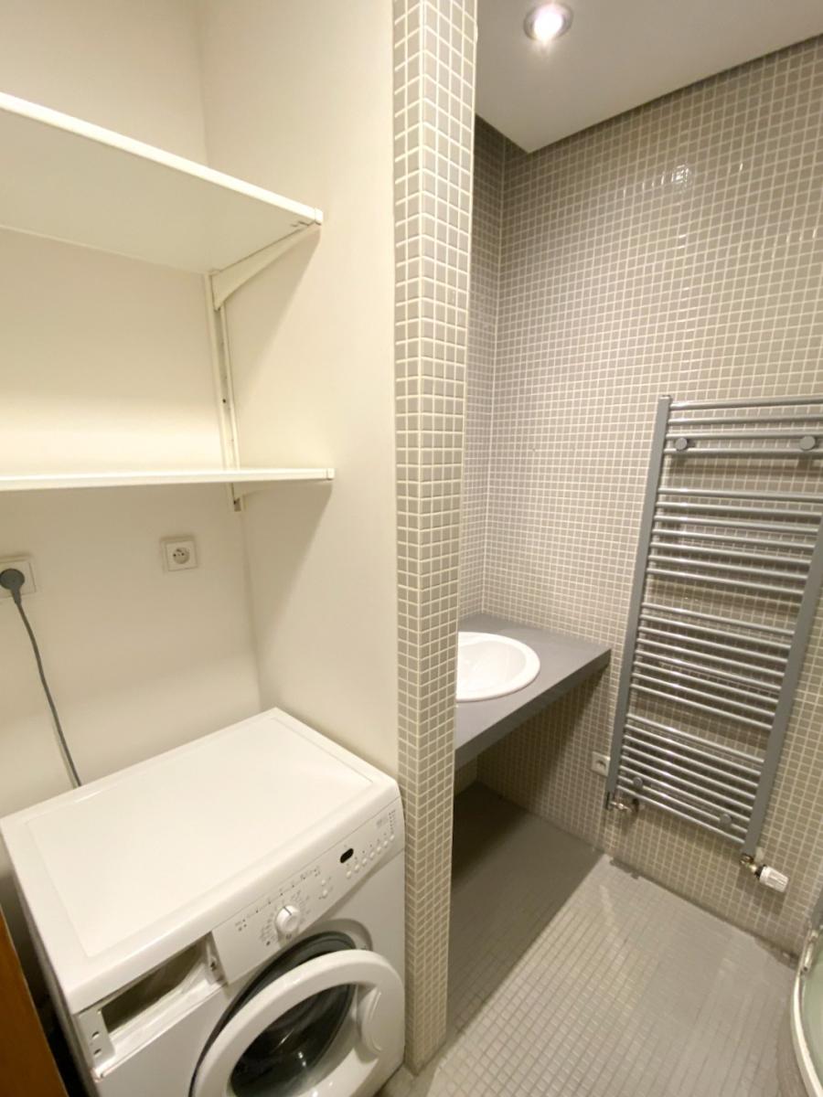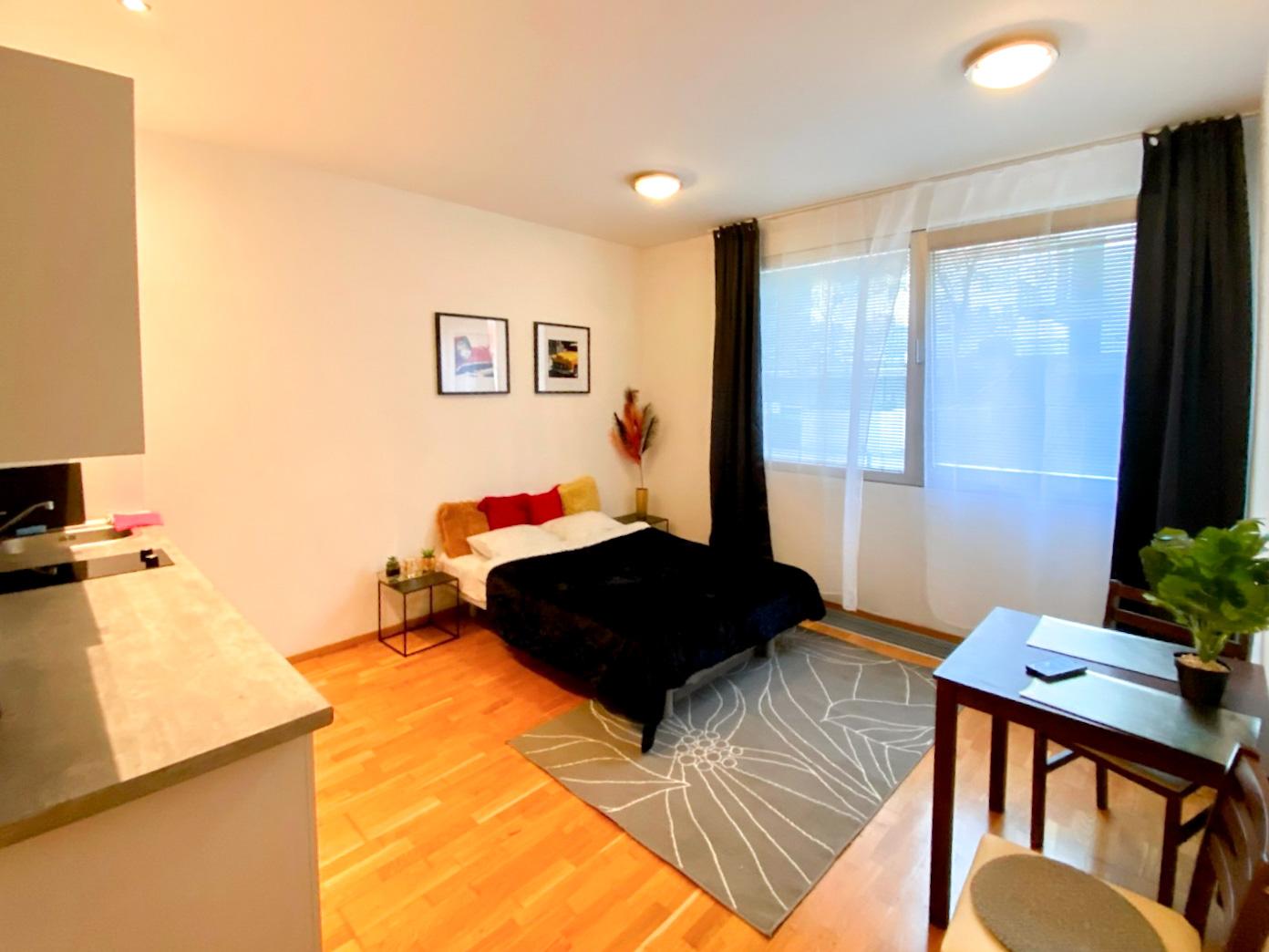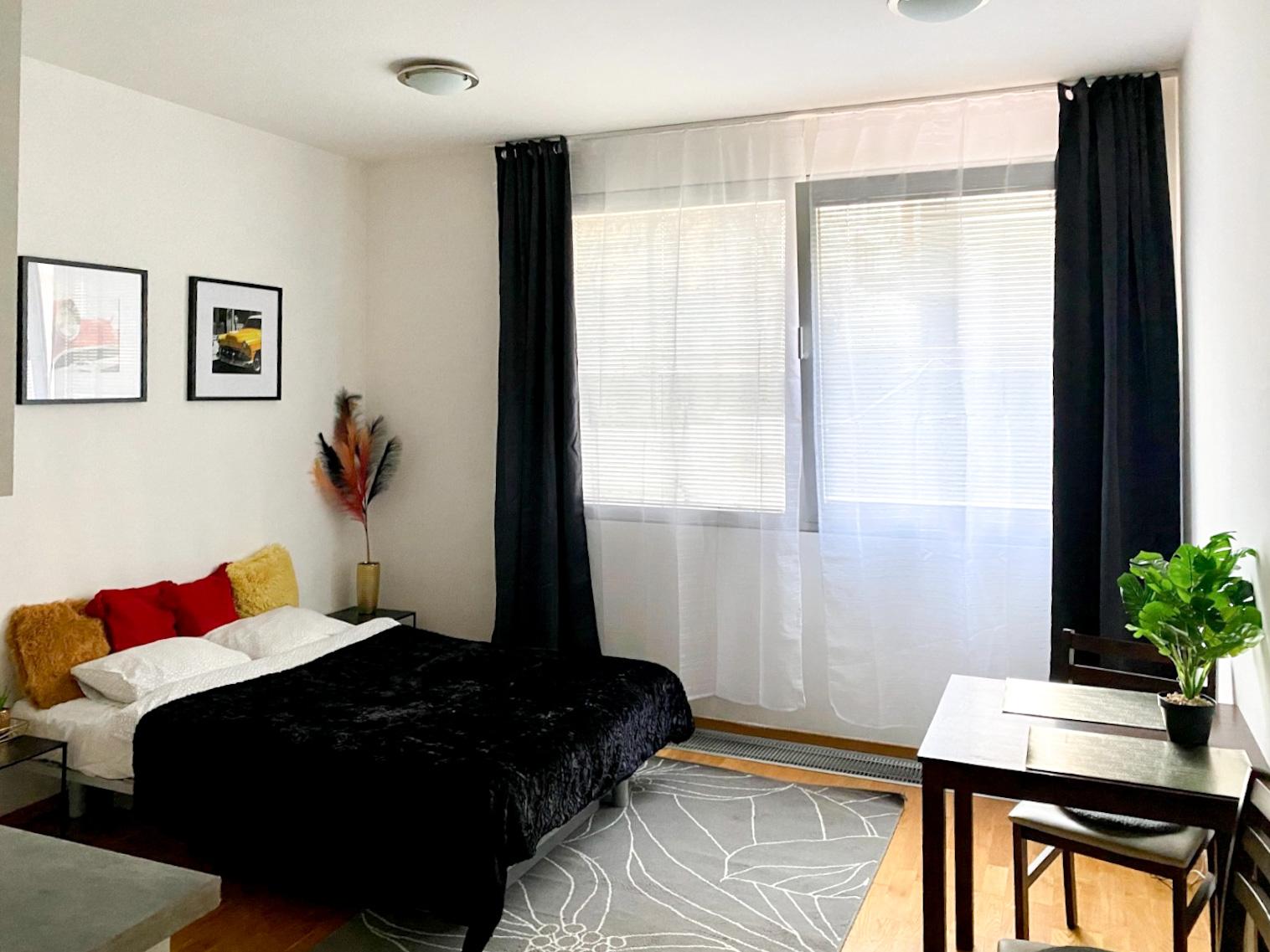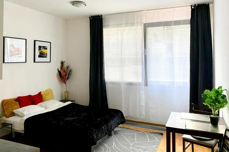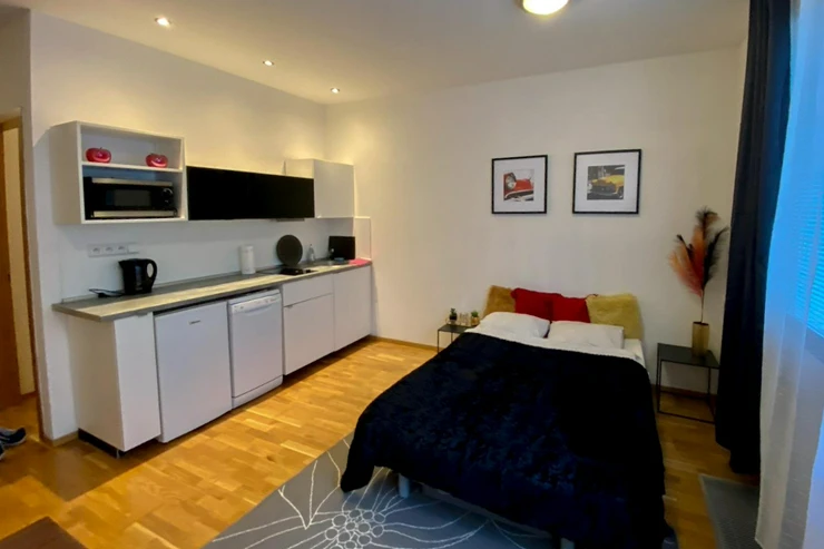 Byt se skládá z prostorného obývacího pokoje s plně vybavenou kuchyňskou linkou (lednice s mrazákem, mikrovlnná trouba, myčka, digestoř), jídelního stolu se židlemi a velké manželské postele. Koupelna je vybavena prostorným sprchovým koutem, umyvadlem, toaletou a pračkou. Byt je nabízen plně zařízený, což zajišťuje pohodlné bydlení bez nutnosti dalších investic.