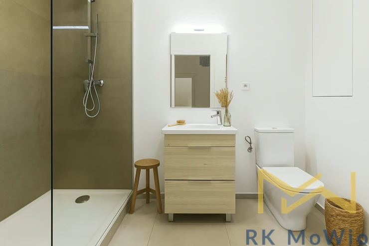 The apartment comprises an entrance hall, a bright living room with a bay window and access to a balcony, a separate kitchen with a dining area, a master bedroom with a fireplace, a second bedroom, one bathroom (with a shower, sink and toilet) and a storage room. Additional apartment features include a modern kitchen unit with a refrigerator and freezer, glass-ceramic cooktop, extractor hood, electric oven and dishwasher; connections for a washing machine and dryer, a fireplace, high-speed internet readiness, wooden floors and tiles.