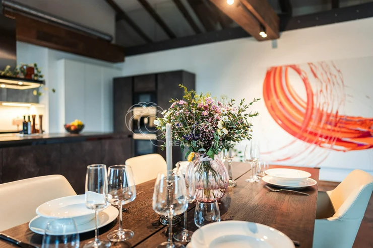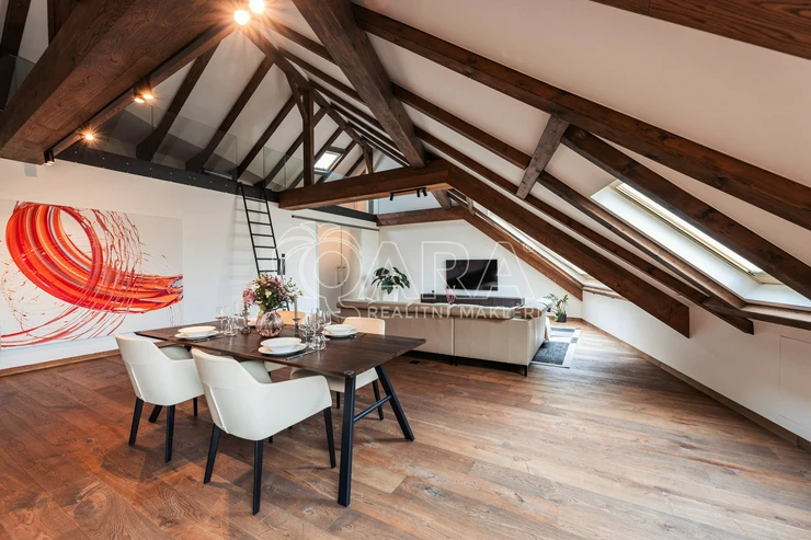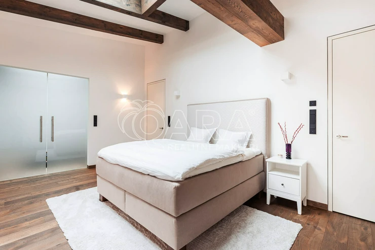 The entire apartment features wooden floors, high ceilings, and an above-standard amount of built-in storage. Comfort is ensured by radiant ceiling heating and cooling, a mechanical ventilation system, Loxone smart-home control, and high-speed optical internet.