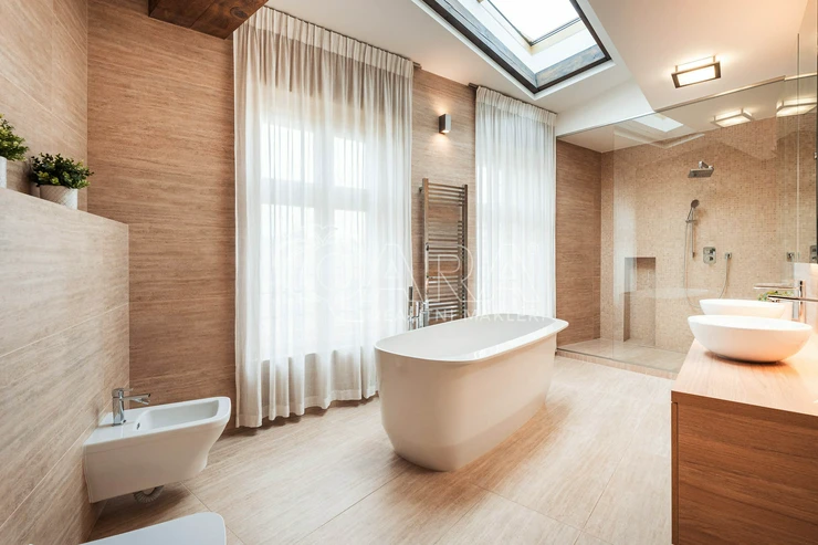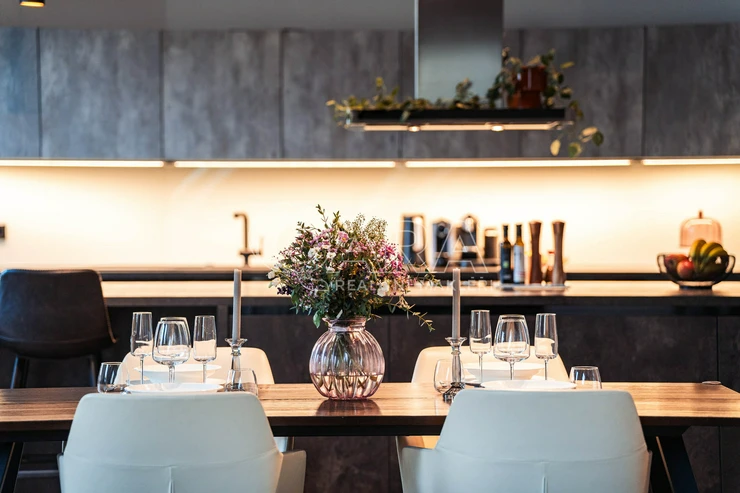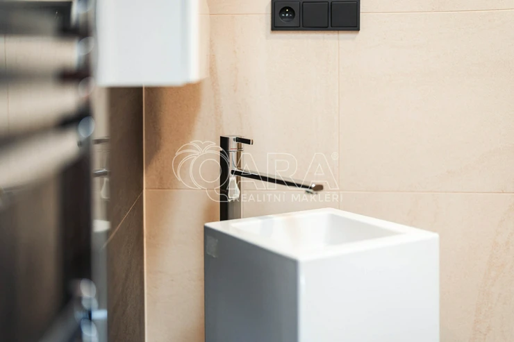 The apartment is rented fully and luxuriously furnished. The kitchen is equipped with modern appliances (induction hob, electric oven, dishwasher, refrigerator, freezer, microwave). The living area features a designer sofa and a TV, plus a dining table with chairs. The master bedroom includes a premium double bed, while the other rooms are currently unfurnished and ready for individual customization. The bathrooms use first-class Preciosa products and benefit from underfloor heating.