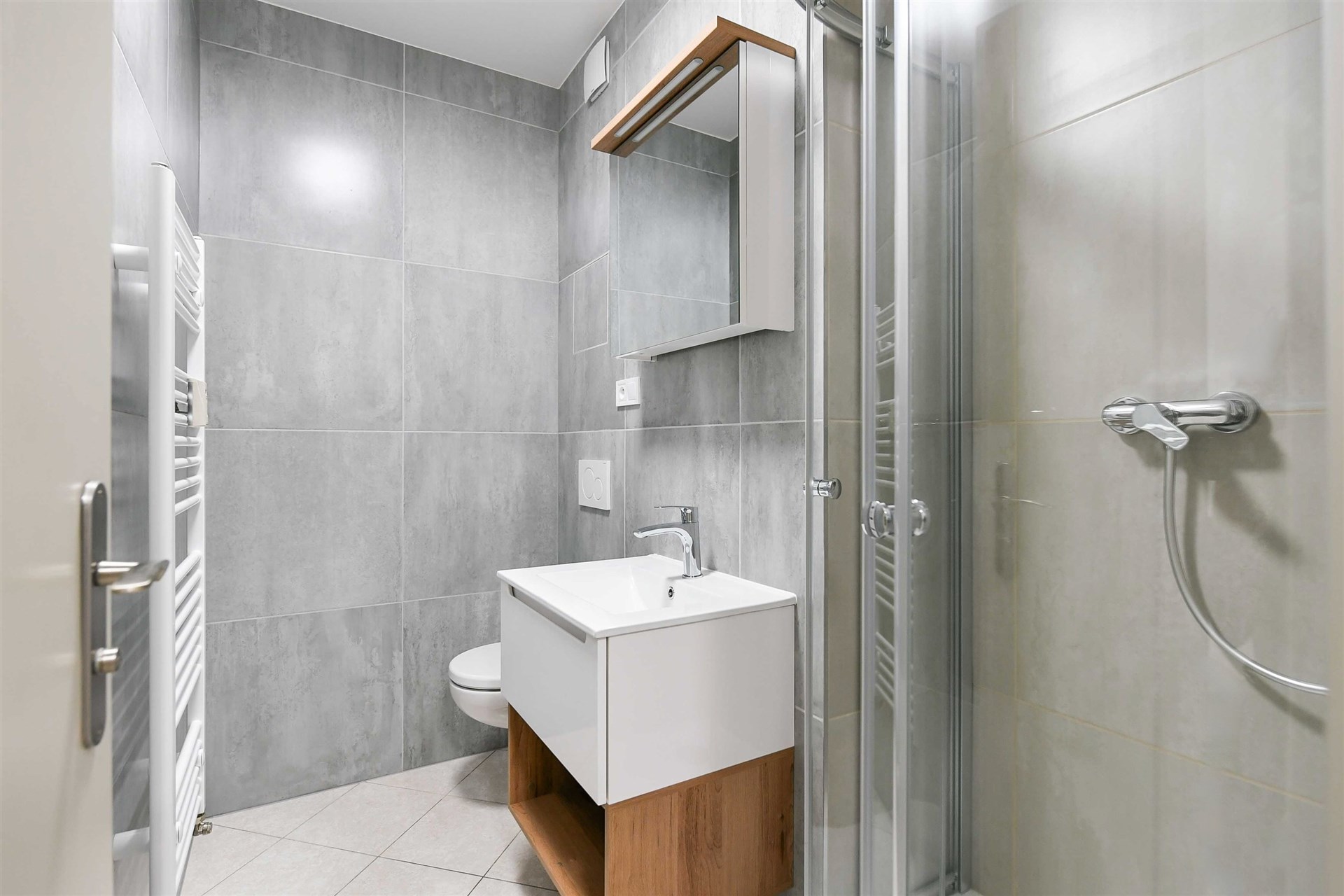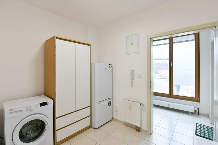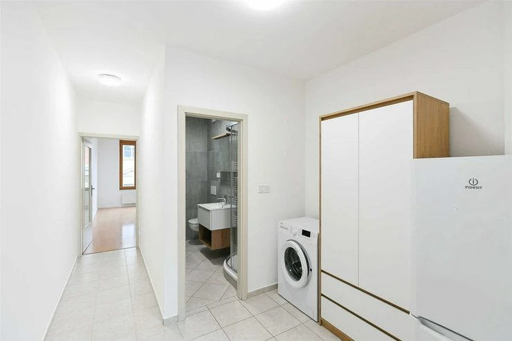 The apartment consists of a room with a window facing south to Štítného street. It features a new kitchenette with appliances, an illuminated worktop, and ceiling lighting. Additionally, there is a large entrance hall in the apartment with storage space, a washing machine, and a new refrigerator, as well as a new bathroom with a toilet, sink, and shower stall.