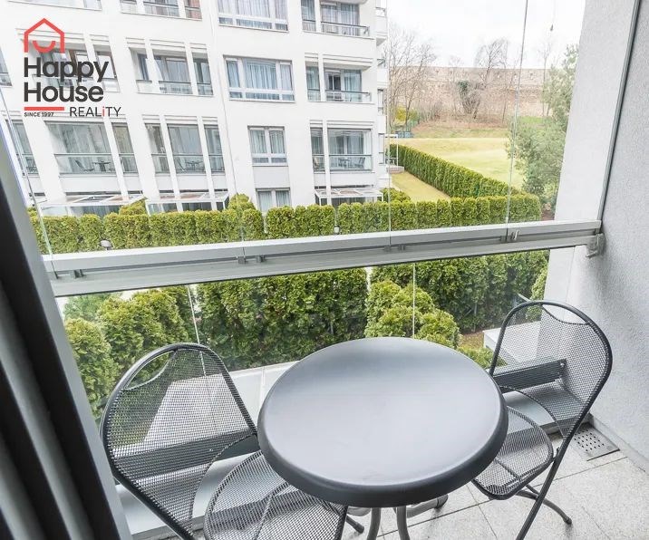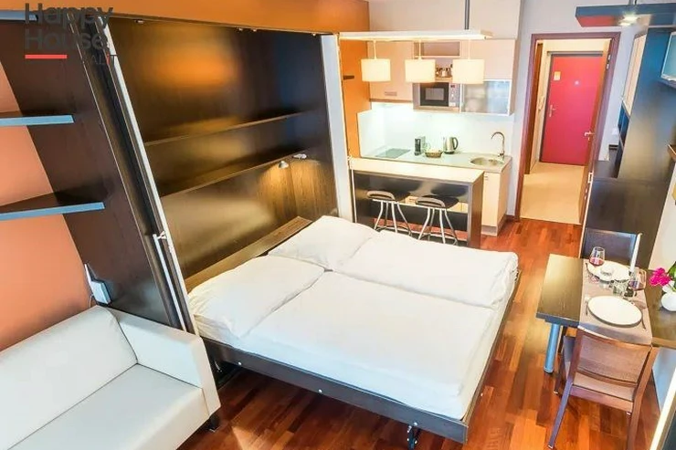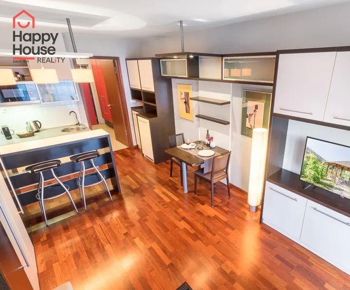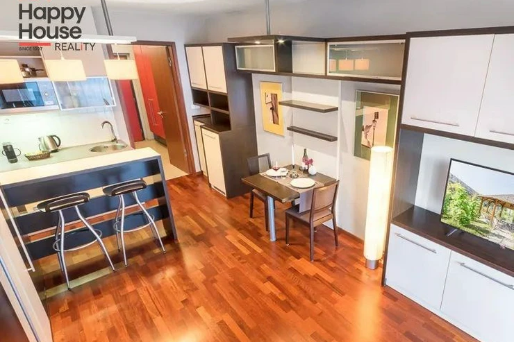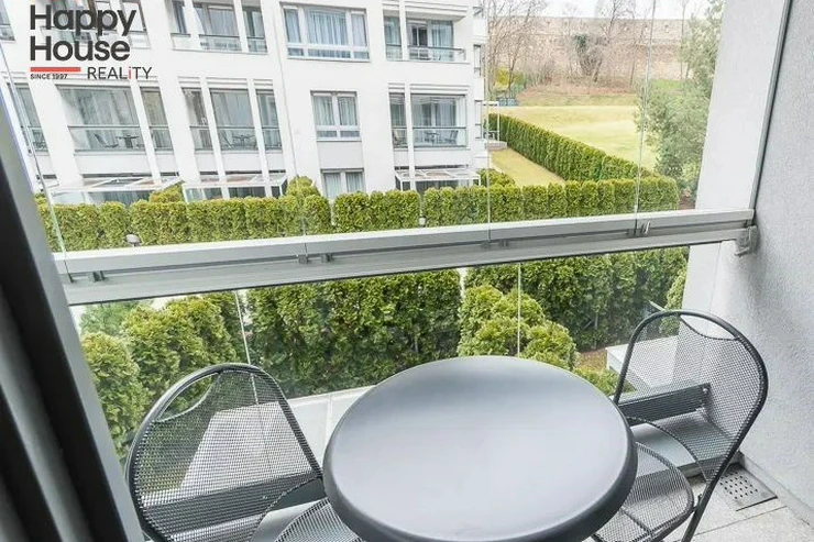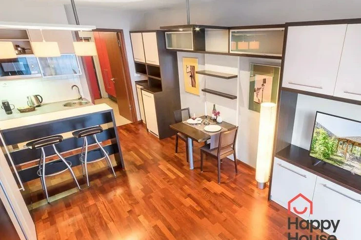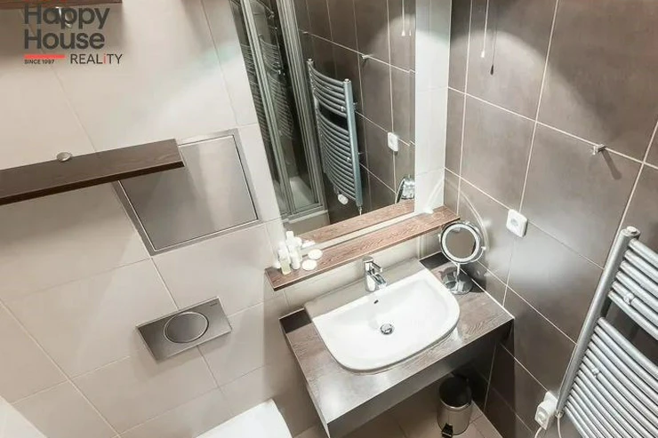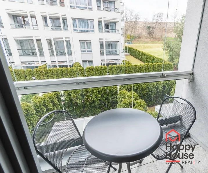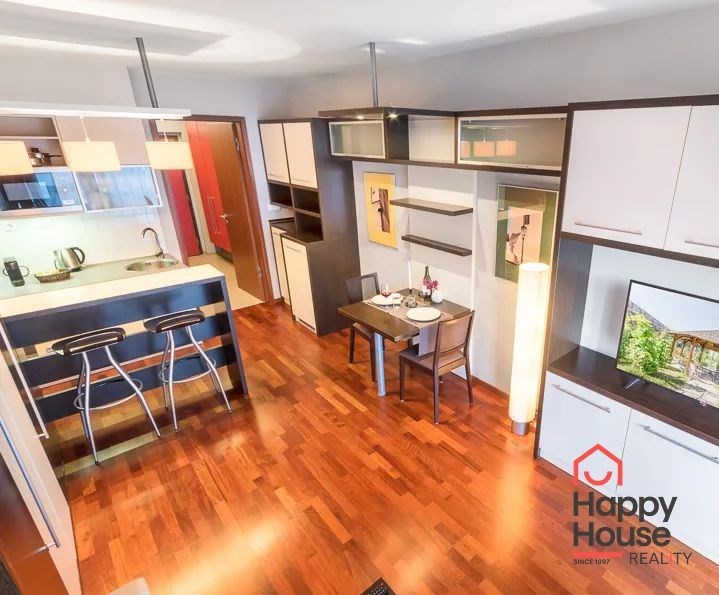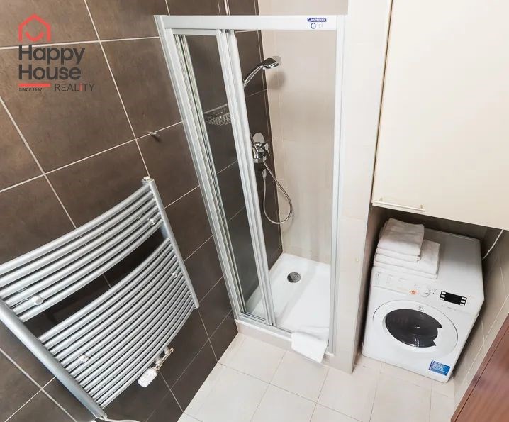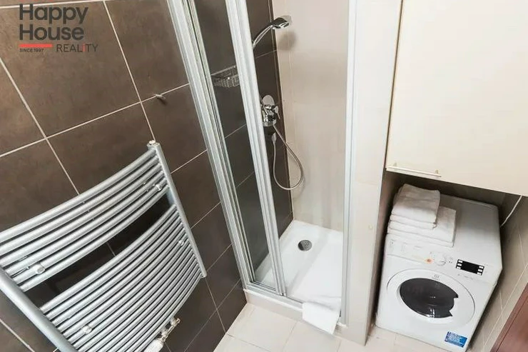 Bright, spacious studio apartment with a balcony on the 2nd floor of a brick building with an elevator in the attractive location of Prague 2 - Nové Město. The apartment is fully furnished with designer furniture and offers an entrance hall, a living room with a kitchenette, a bedroom, a pantry and a bathroom. In the kitchen corner there is a line with built-in appliances (fridge with freezer, ceramic hob, electric and microwave oven, dishwasher and hood). Bathroom with shower, toilet, washing machine, dryer and heating ladder. Wifi and SAT TV available. Wooden floors, tiles. Underfloor heating. Large wooden windows and ample storage space in built-in wardrobes ensure sufficient light in the apartment. Comfortable anatomical mattresses. Video intercom in the apartment. The building has a 24/7 reception. Campus security 24/7. Possibility to rent a garage in the basement.