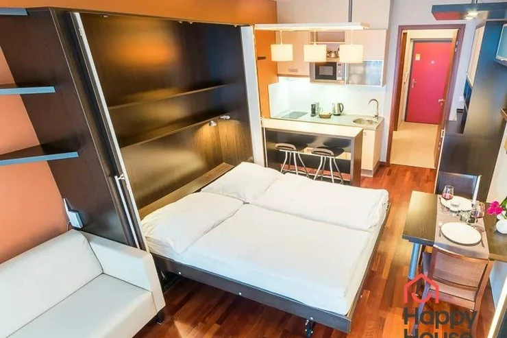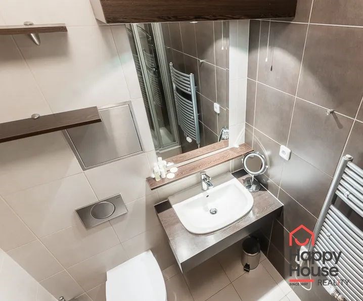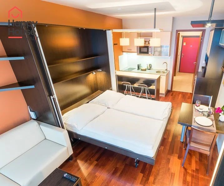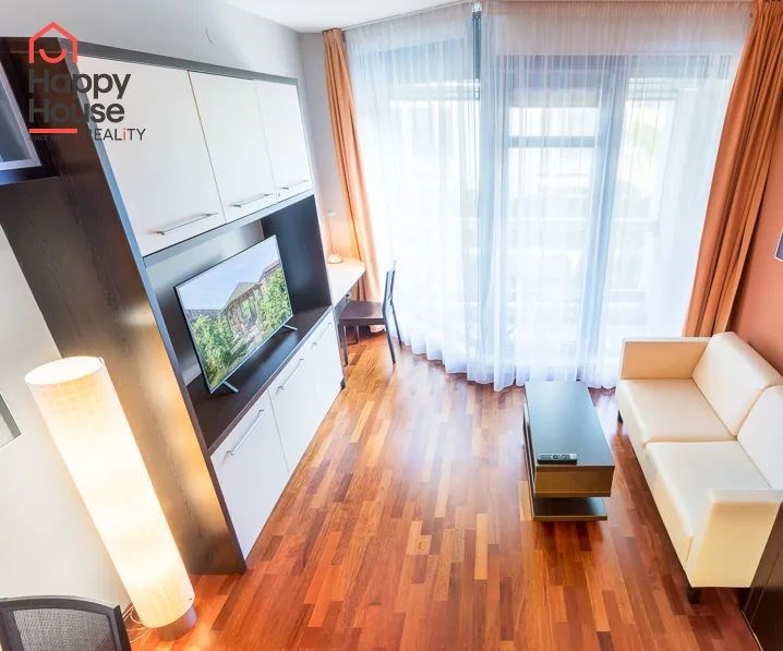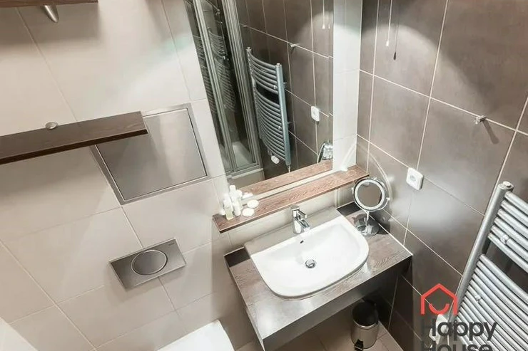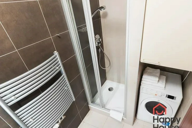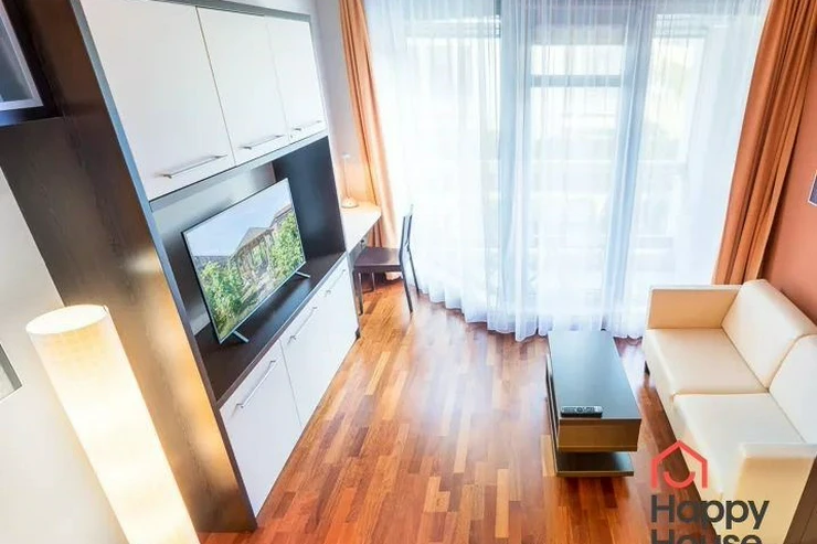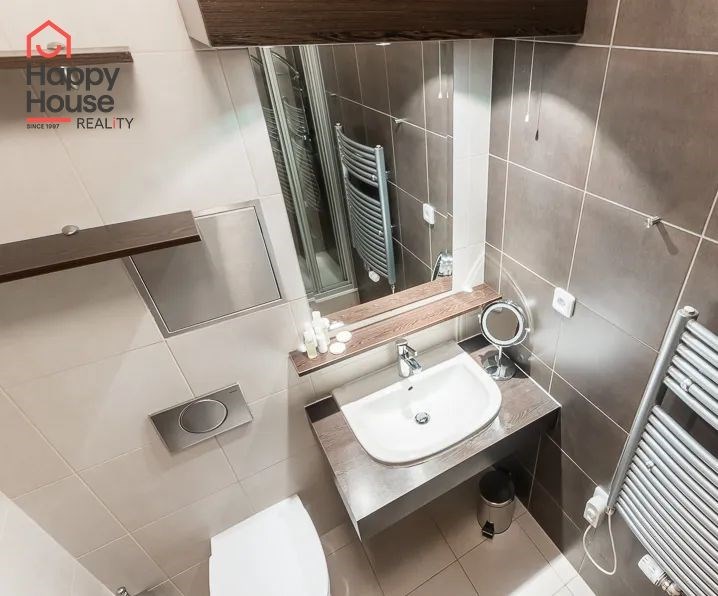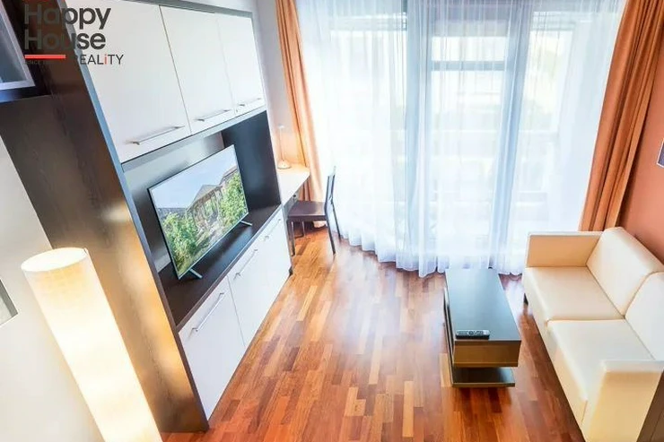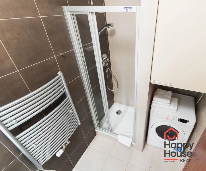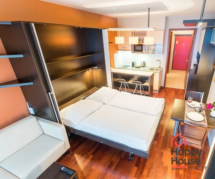Bright, spacious studio apartment with a balcony on the 2nd floor of a brick building with an elevator in the attractive location of Prague 2 - Nové Město. The apartment is fully furnished with designer furniture and offers an entrance hall, a living room with a kitchenette, a bedroom, a pantry and a bathroom. In the kitchen corner there is a line with built-in appliances (fridge with freezer, ceramic hob, electric and microwave oven, dishwasher and hood). Bathroom with shower, toilet, washing machine, dryer and heating ladder. Wifi and SAT TV available. Wooden floors, tiles. Underfloor heating. Large wooden windows and ample storage space in built-in wardrobes ensure sufficient light in the apartment. Comfortable anatomical mattresses. Video intercom in the apartment. The building has a 24/7 reception. Campus security 24/7. Possibility to rent a garage in the basement.