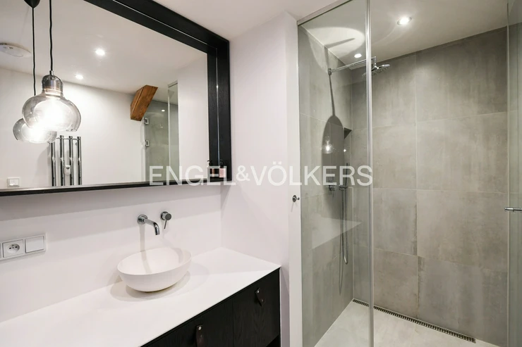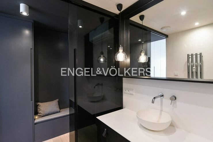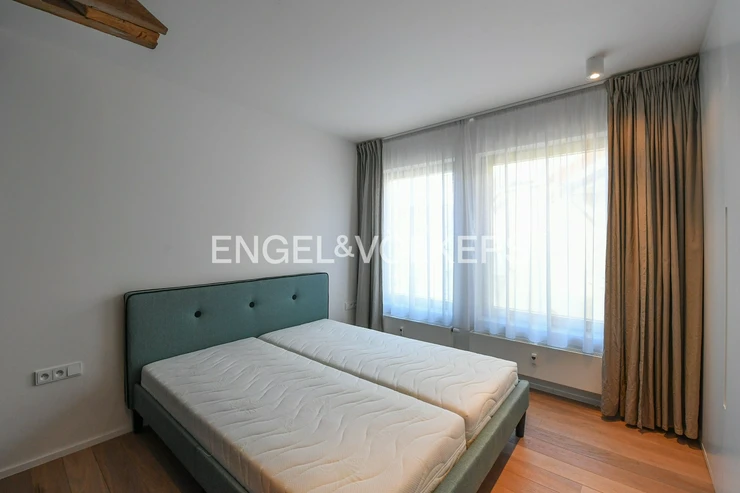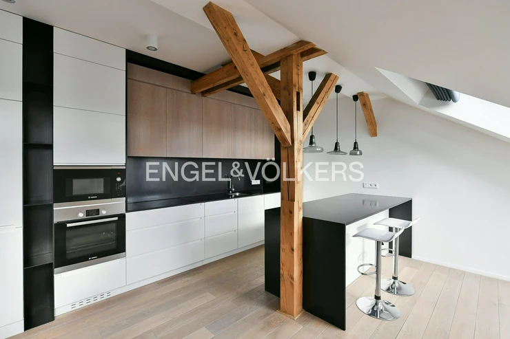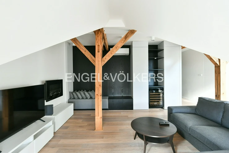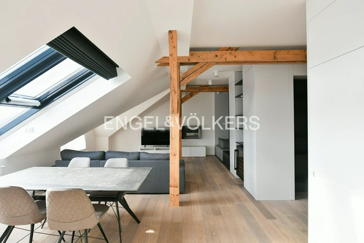 Historic apartment house after complete renovation in one of the most desirable locations in Prague, right on Jiřího z Poděbrad Square. Representative common areas of the house and an elevator up to the top floor, where this magnificent apartment is situated. The renovation took care to preserve all original decorative and architectural elements of the house. High-quality tiles and sanitary equipment were used for the renovation of the apartment, solid wood floors were laid and all rooms of the apartment are air-conditioned. The dominant feature of the apartment is the spacious bright living room facing the square, which has a fully equipped kitchen with quality appliances including a wine fridge. Both bedrooms are then oriented towards the quiet courtyard and one of them has its dressing room and en-suite bathroom. The smaller bedroom also has its own built-in wardrobe. There are two bathrooms in total, one en-suite, the other accessible from the hallway. The equipment also includes numerous built-in storage spaces, a washing machine, and a dryer, with the option to add furniture if required. The apartment comes with a parking space in the secure underground garage of a nearby parking complex.
