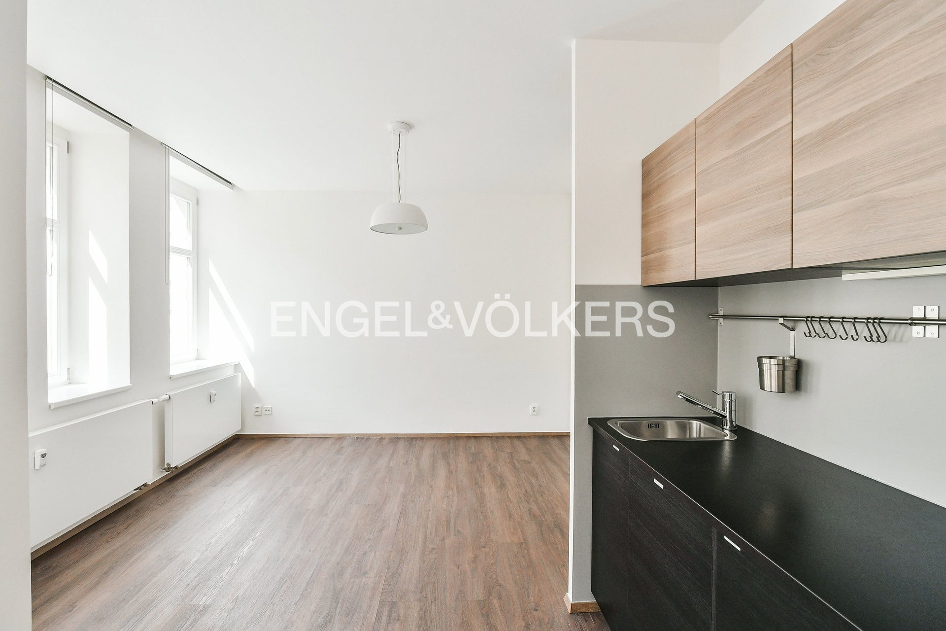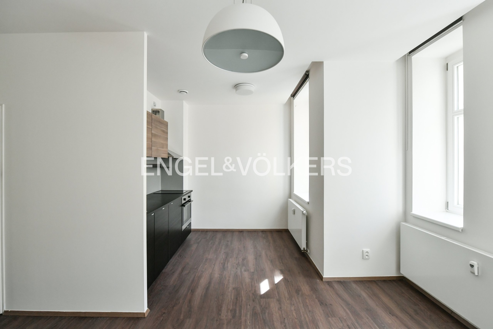 The apartment consists of a smartly designed room with a kitchenette equipped with a two-burner hob, extractor hood, oven, and refrigerator with freezer. The bathroom has a shower corner and a toilet. The equipment also includes a washing machine with a dryer. Thanks to built-in wardrobes, the apartment offers plenty of storage space.