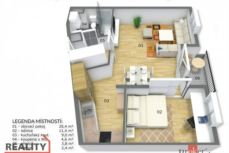 Byt je umístěn ve 2. patře domu s výtahem. Dispozičně je rozdělen na předsíň s vestavěnou skříní s přímým vchodem do koupelny se sprchovým koutem a toaletou. Obývací pokoj je propojen s plně vybaveným kuchyňským koutem. Spací část je oddělena od obytné posuvnými dveřmi. Jednotka je částečně vybavena nábytkem, krom sedací soupravy, konferenčního stolku židlí u kuchyňského stolu a TV, vše zůstává.