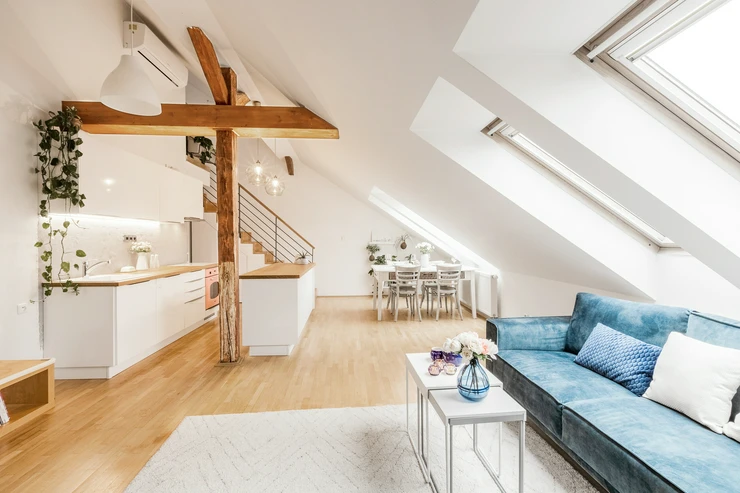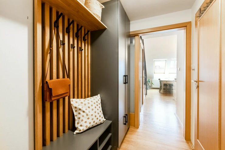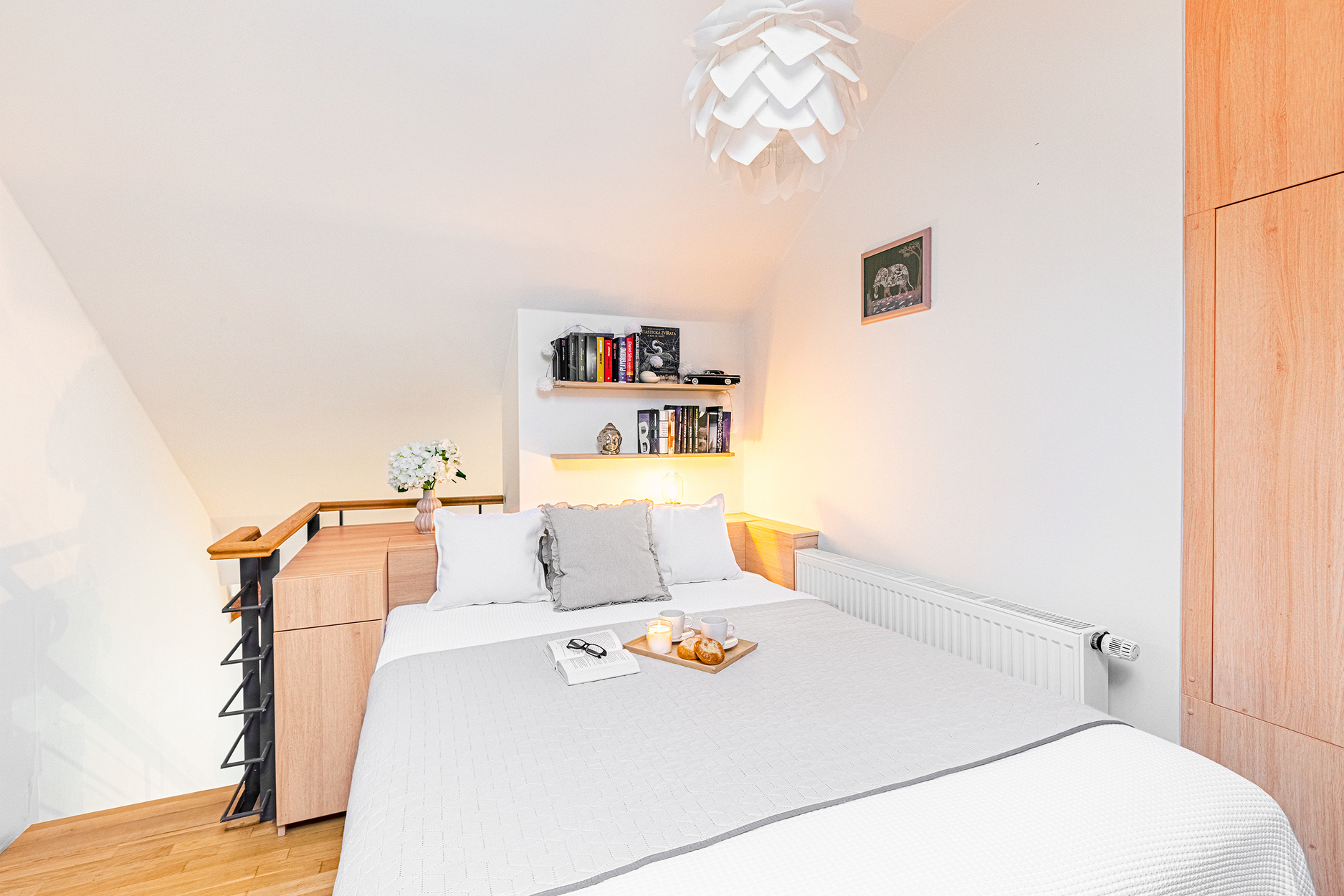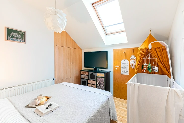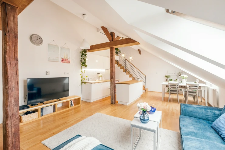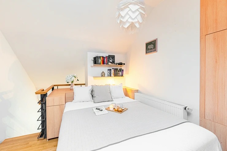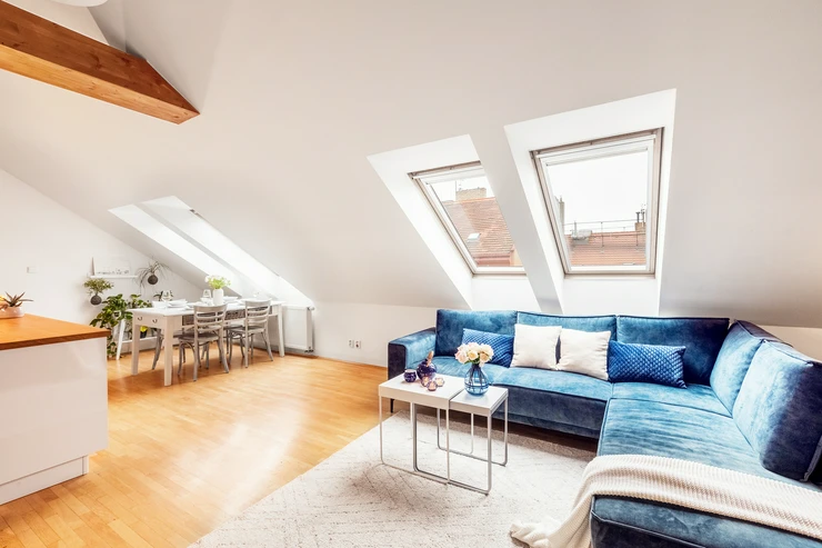 This loft apartment is on a quiet street in the very enjoyable Prague neighborhood of Vršovice.