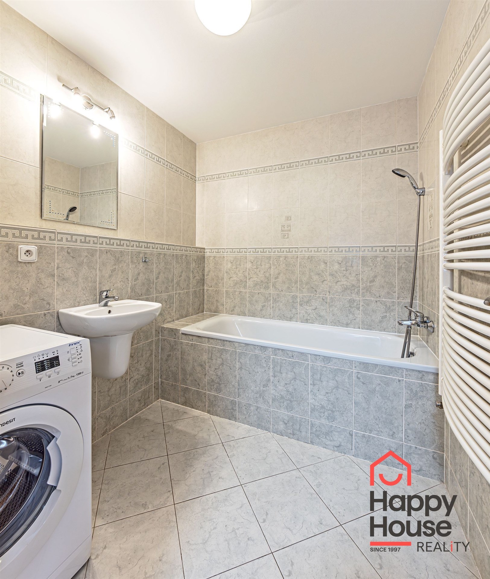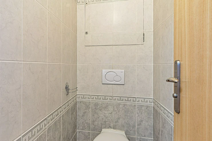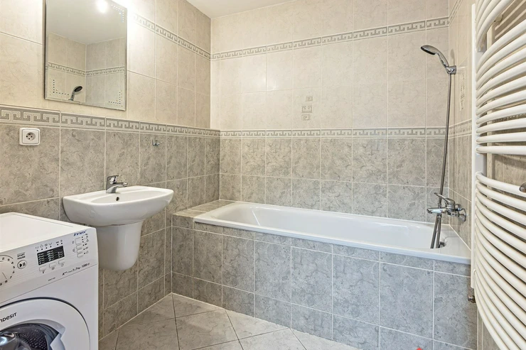 The apartment is unfurnished and consists of an entrance hall with a built-in wardrobe, a living room with a spacious kitchenette, a separate bedroom, a bathroom with a bathtub, a heating ladder, and a washing machine, and a separate toilet.
