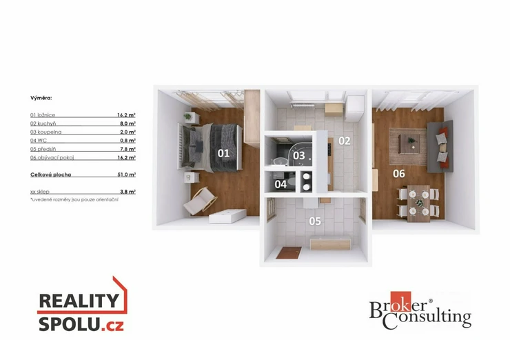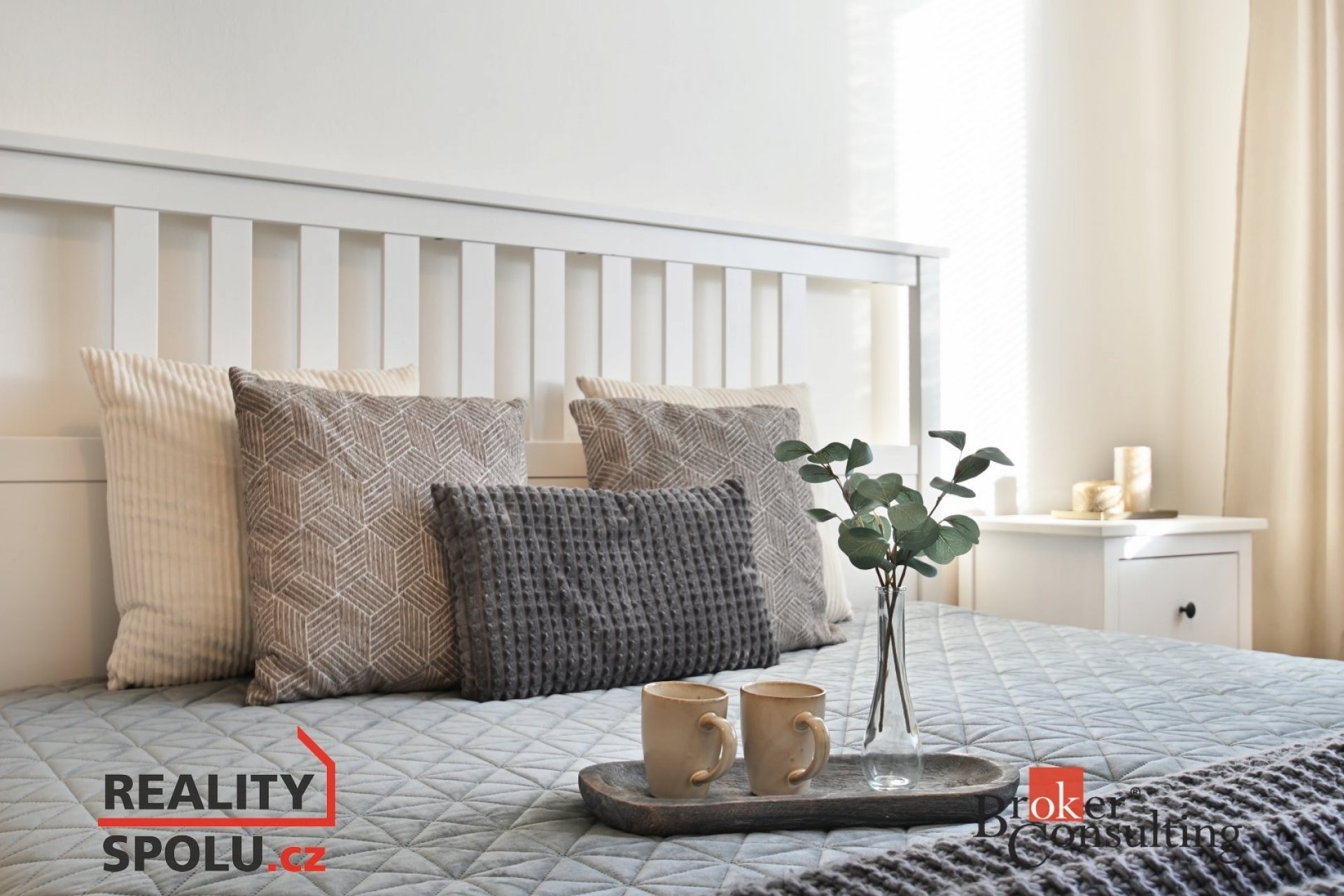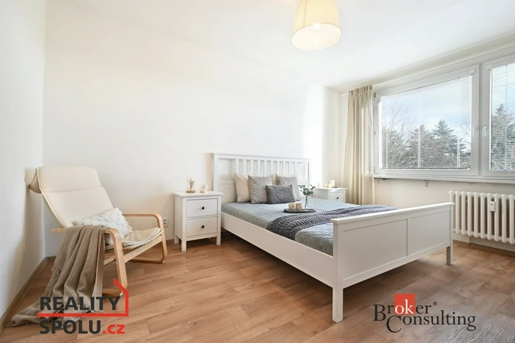 Dvě stejně velké a světlé místnosti o rozměrech 16 m², obývák i ložnice vhodné pro relaxaci i práci.