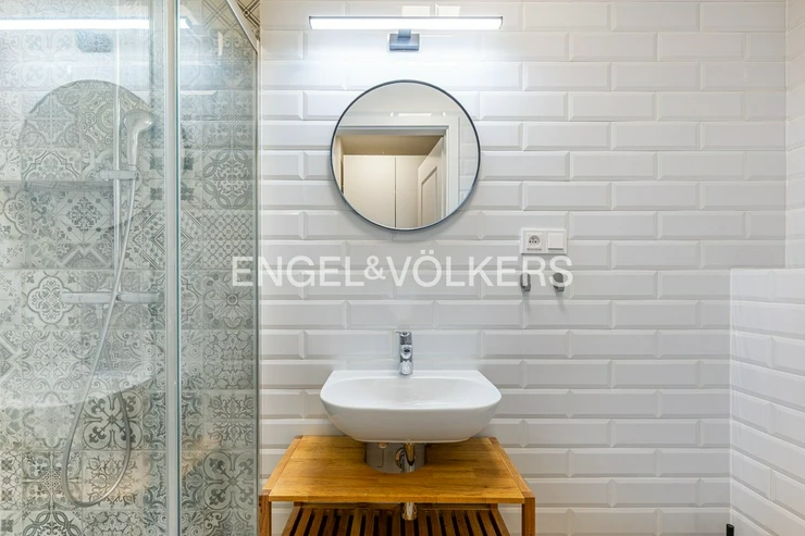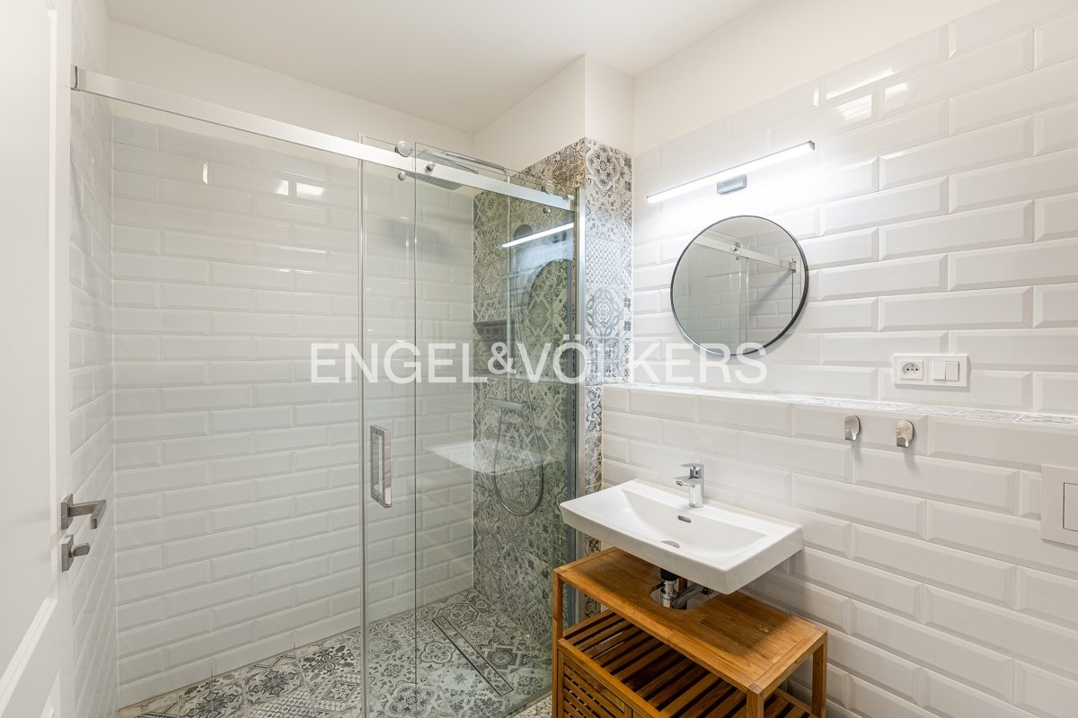 This spacious apartment offers a hallway with a custom-made kitchenette, three rooms, and two bathrooms with showers. The apartment also includes a practical storage room, which provides additional storage space. The interior is finished to a high standard – solid wood floors, wooden windows, security doors, kitchen with built-in appliances (dishwasher, refrigerator with freezer, hood, induction hob, oven, microwave). Each bathroom has a bidet shower.